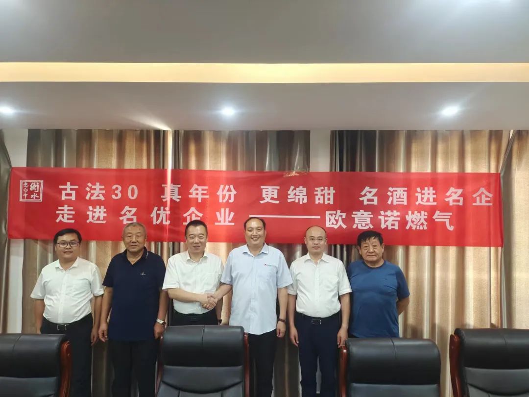 9月12日,衡水老白干营销有限公司副总经理石新勇、衡水高端酒大区经理何超、衡水高端酒大区南部分公司经理李健,枣强经销商天外天商贸郭总等一行走进战略合作企业纳森集团和欧意诺燃气开展企业交流活动,纳森集团总经理李国和欧意诺燃气董事长李军参加活动。