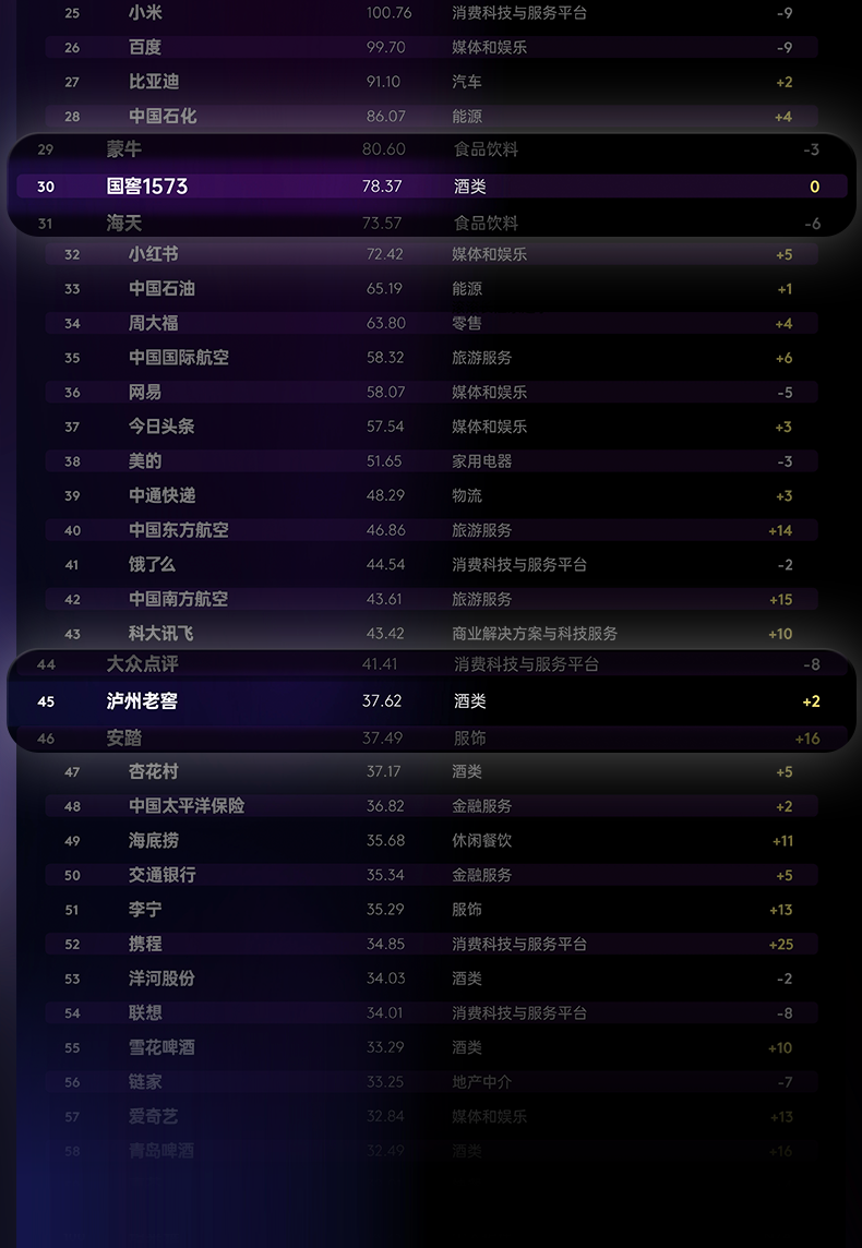 在本次发布的榜单中,泸州老窖和国窖1573双双上榜,其中泸州老窖较去年提升两位。这得益于泸州老窖公司过去一年里的高质量稳健发展,坚持守正创新,不断丰富打造品牌矩阵,在激烈的市场竞争中保持定力,彰显出良好的品牌韧性和抗风险能力。
