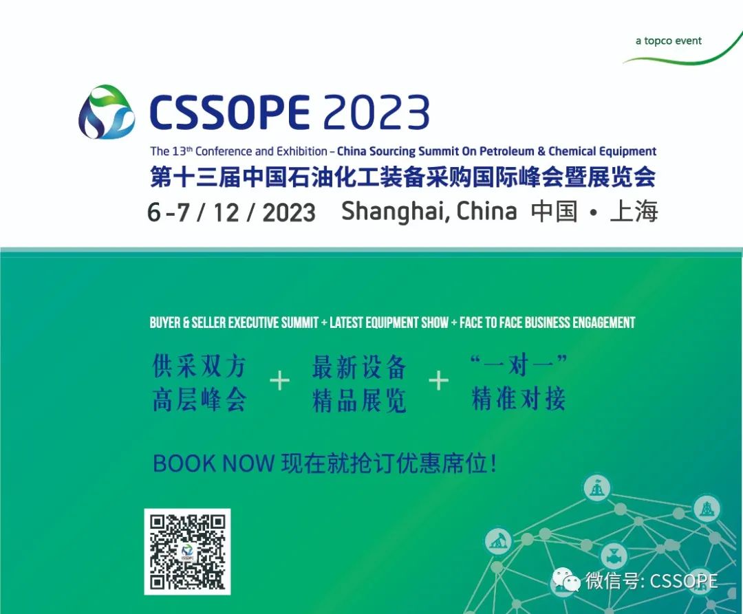应业主、供应商及服务商的急迫需求,“第十三届中国石油化工装备采购国际峰会暨展览会(CSSOPE 2023)”将于2023年12月6-7日在上海举办,主题:“石油石化节能降碳,布局新能源产业链,协同打造可持续发展”。为期两天的展会同期将举行CSSOPE采购峰会,围绕传统油气能源(第一天)及新能源(第二天)的项目动态及设备采购需求对接,侧重最新政策、行业趋势、项目信息、市场动态和采购需求,助力供采双方高效精准对接、深化供应链合作,推动石油化工行业节能降碳,布局新能源产业链,协同打造可持续发展。