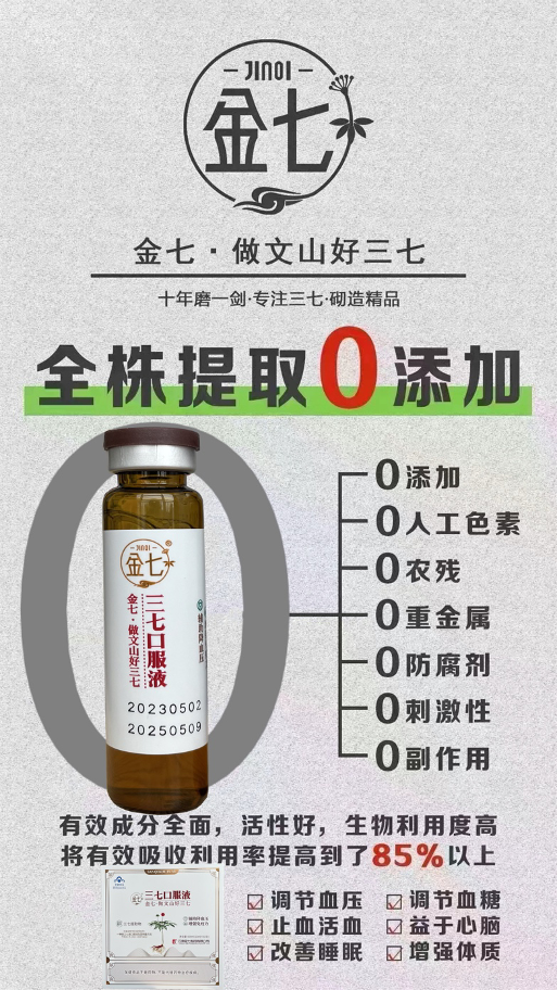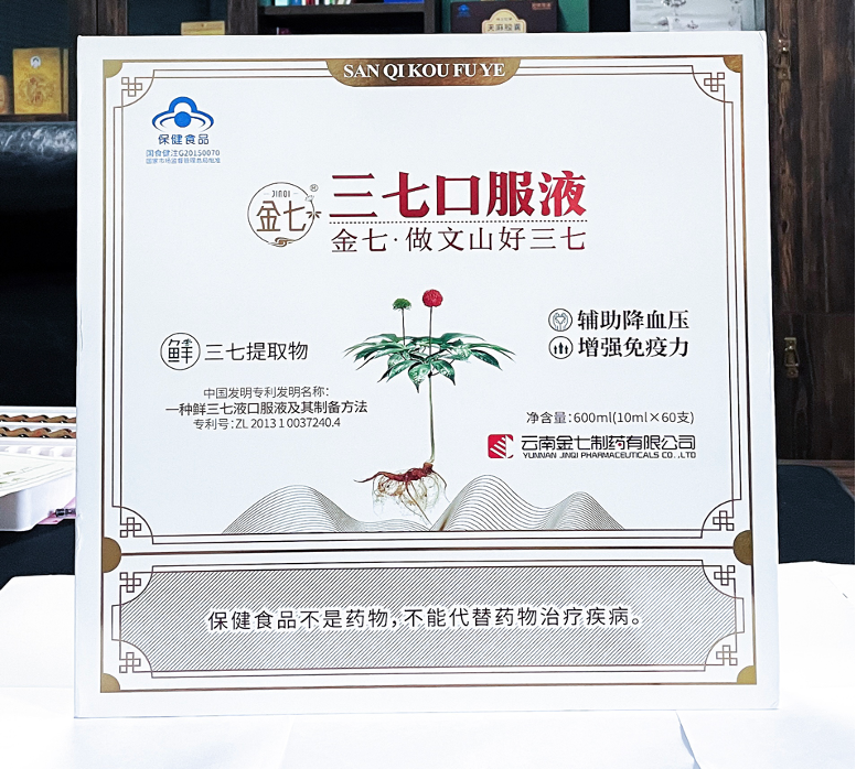 云南金七制药三七口服液,市面上一款获得{一个批号:【国食健字号 (G20150070);两个批文:1.辅助降血压,2.增强免疫力}的三七提取制剂。