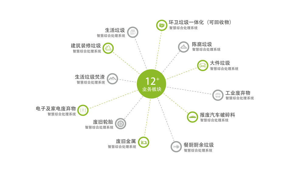 科选环境业务系统涵盖城市大宗固废十二大板块:建筑装修垃圾资源化处理系统、生活垃圾资源化处理系统、生活垃圾焚渣资源化处理系统、电子及家电废弃物资源化处理系统、废旧金属资源化处理系统、废旧轮胎资源化处理系统、餐厨(厨余)垃圾资源化处理系统、报废汽车破碎料资源化处理系统、大件垃圾资源化处理系统、工业废弃物资源化处理系统、陈腐垃圾资源化处理系统、环卫垃圾一体化(可回收物)资源化处理系统等众多固废资源化综合处置领域。