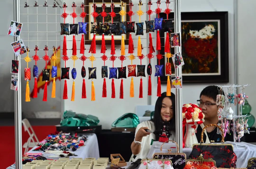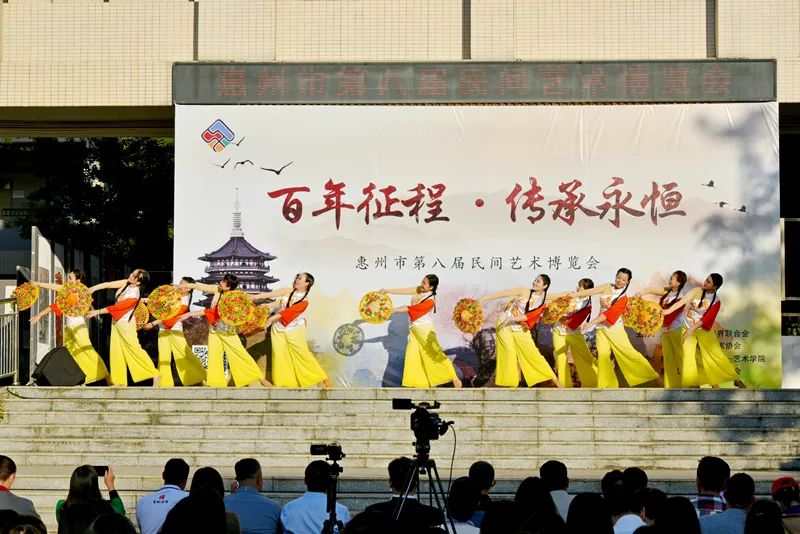 2021年12月“百年征程•传承永恒”的惠州市第八届民间艺术博览会在惠州城市职业学院——艺学院(“惠州非遗文化小镇”)开幕。惠州市第八届民间艺术博览会首次采用民间艺术与高等院校相结合的形式,将民间艺术带进校园,在充满书香和朝气的惠州城市职业学院展开为期一个月的民间艺术作品展览。各个展厅展示的作品有陶瓷、泥塑、釉上彩、釉下彩、刺绣、押花、景泰蓝、玻璃琉晶、玉雕、木雕、剪纸、纸扎、农民画、国画、书法等近20个门类、400件的工艺作品。本届艺博会结合当前形势,推陈出新,以1.8万学生为载体,在云端大力推进,将优秀民间文化展示给群众。采用“线上线下结合”的传播方式,以“百年征程,传承永恒”为主题,充分展示了 民间艺术家们在工艺创作方面的成就。
