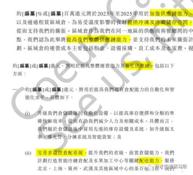 前端的供应链、仓储物流是走向规模化和标准化运营的基础。通过观察这类企业的招股书,乡村基、蜜雪冰城、锅圈等募投资金都将投入到完善或升级供应链,进一步布局上游,已成为行业趋势。