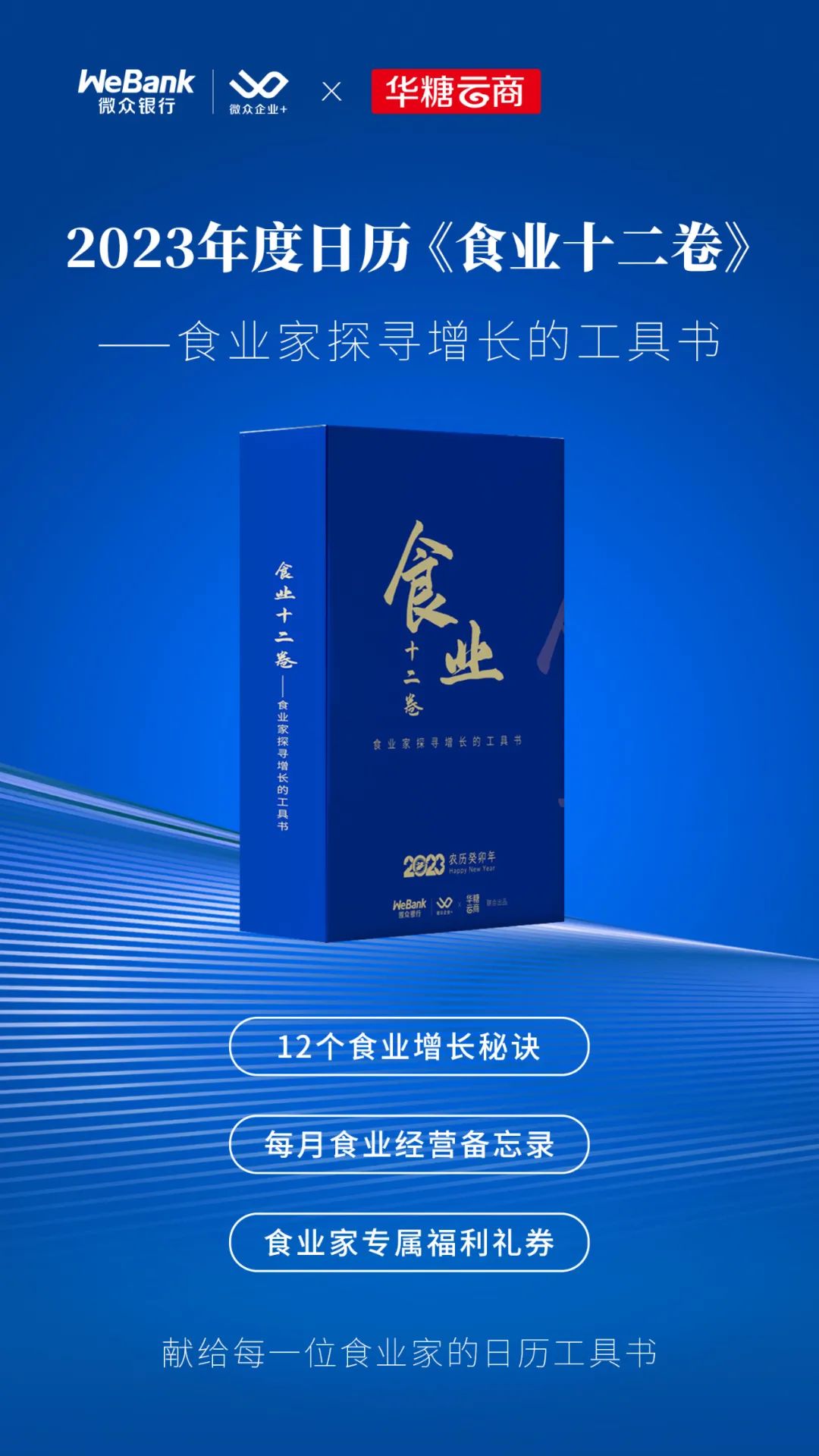 以洞见企业的经营增长为需求,在即将到来的2023年,微众银行微众企业+联合华糖云商特别推出“食业十二卷”2023新年台历,以食品行业十二位优秀企业家和经销商的真实故事为原点,总结十二大经营秘诀,助力食业家探寻新增长路径。这份精美台历也将作为新年礼物,向广大企业家和经销商朋友进行赠阅和发放,下方评论区留言即有机会获取。