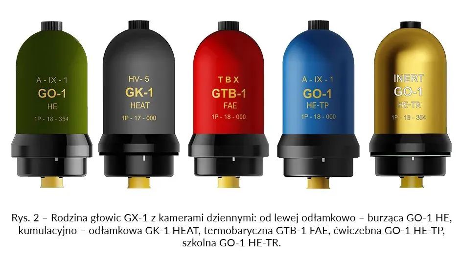 该巡飞弹有效载荷可换波兰BUMA公司(PGZ集团的一部分)生产的多型号GX-1弹头,每枚弹头重约1.4千克。GO-1 HE-TR训练弹头内部无爆炸物,可用于操作人员训练瞄准和制导范围,GO HE-TP训练弹配备了20克轻的炸药,让命中情况可视化;它可用于训练操作员瞄准和击中目标,GTB-1 FAE燃料-空气爆炸弹头,内装炸药600克,有效半径为10-12米,可用于对抗步兵和建筑物;GO-1 HE弹头装炸药550克,有效半径30米,可用于对抗轻型装甲车、设防阵地和步兵;GK-1 HEAT破甲弹头装有500克炸药,保证至少180毫米RHA装甲的穿透力,可以用来对付坦克及其乘员。每个弹头均采用广角定焦昼间或夜间CCD镜头。在用于侦查任务时,Giez巡飞弹可配备GS9光电红外侦查载荷,由一个稳定的昼夜头和两个传感器组成,在侦查后可在回收区用新安装的降落伞着陆。使用触摸屏战术遥控器和安装在三脚架上的上下行数据链路天线进行遥控,采用军用数字双向加密设计。有趣的是本次展会的巡飞弹将摄像头安装在机背顶部,使用不带摄像头的GX1弹头,好处是可以用性能更好的摄像头。