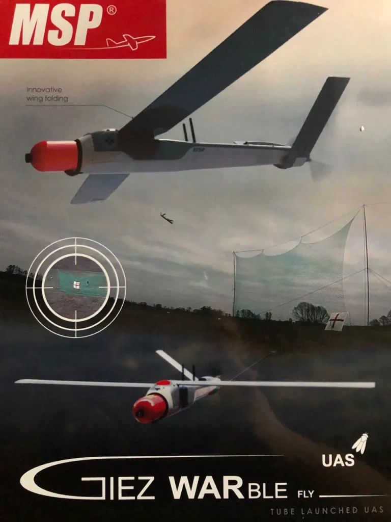 首先是波兰Zielonka军事技术学院展示的Giez巡飞弹系统。即配备导弹的飞行、无人、制导装置。巡飞弹本身长1.075米,翼展1.66米,最大速度150千米/时,巡航速度80-95千米/时,续航时间30分钟,升限2000米,在潜在目标区域的巡逻时间为20分钟,控制范围10千米。该巡飞弹的机翼和尾翼均可折叠,采用尺寸为200x200x1350毫米的弹箱运输。加上弹头和发射容器重量不到12千克,可以由一名士兵携带。无人机通过燃气发生器从发射器中弹出,自动展开机翼和尾部,并通过启动电力驱动装置推进式螺旋桨获得动力。巡飞弹无需预组装即可起飞,系统准备时间甚至不到一分钟。