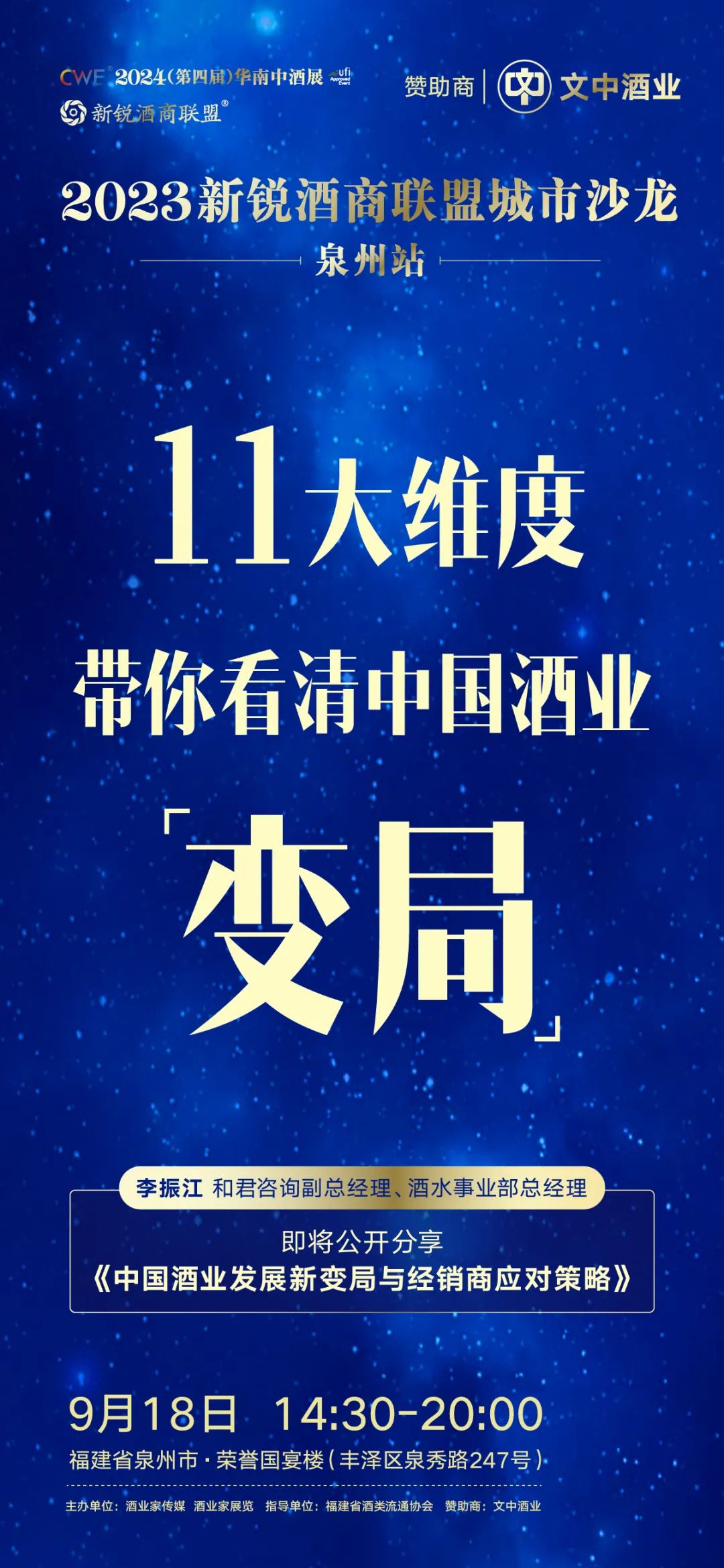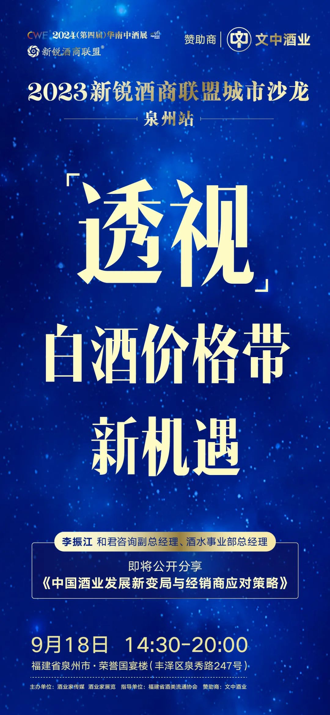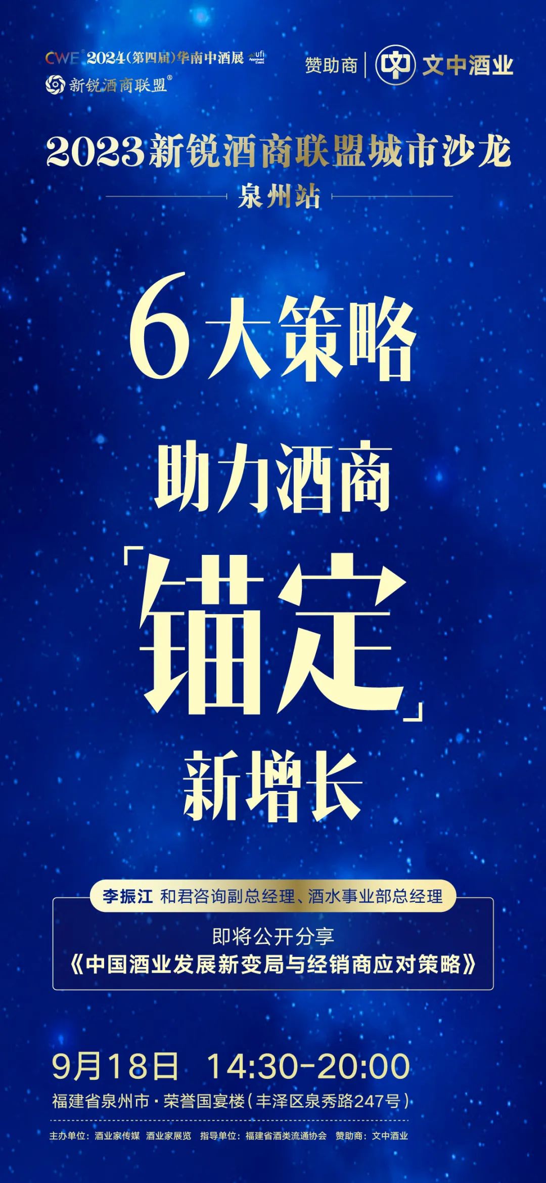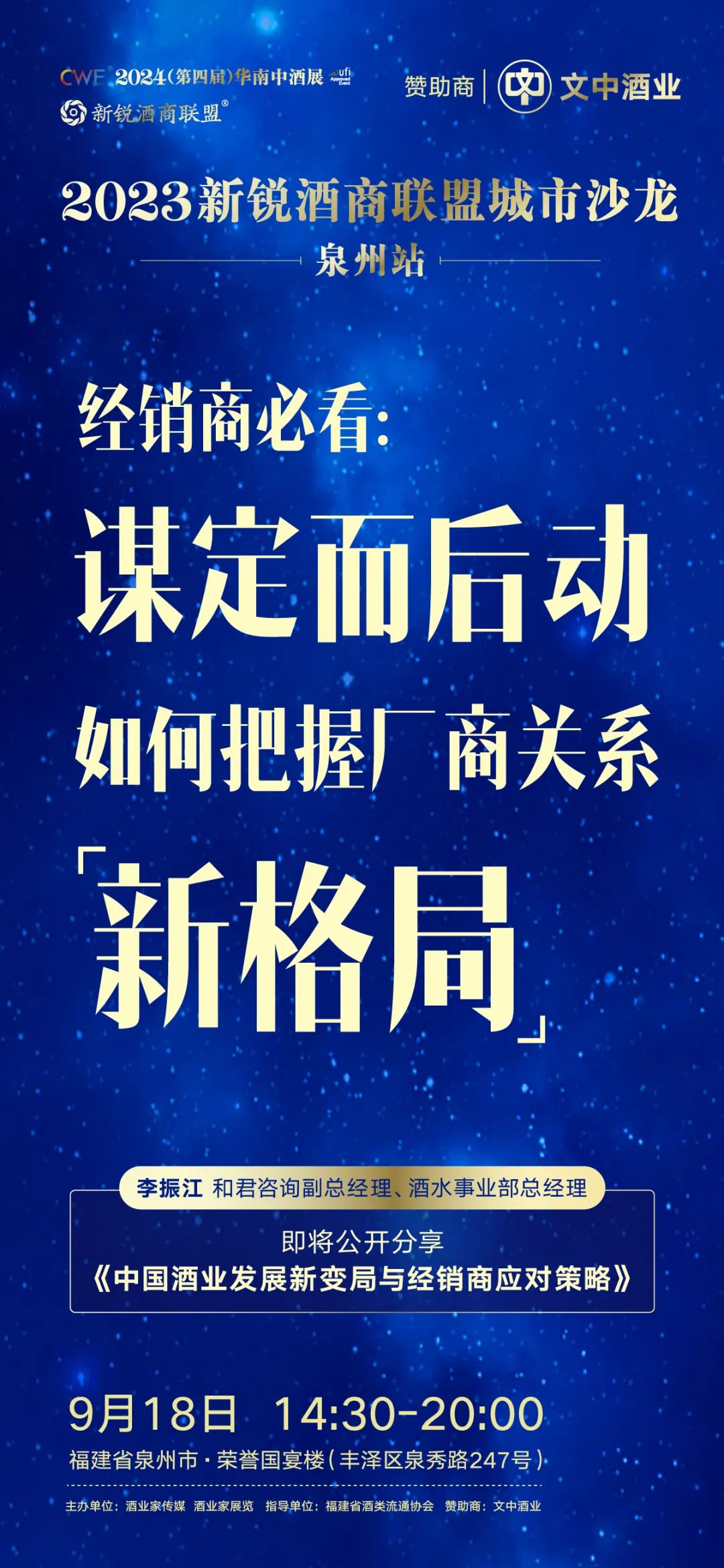 9月18日14:30-20:00,2023新锐酒商联盟城市沙龙将落地泉州,福建省酒类流通协会驻泉州联络处负责人、福建省企业家公益协会常务副会长法人代表陈文贵,和君咨询副总经理、酒水事业部总经理李振江,文中酱酒广东区域总经理曾令行等嘉宾与您相约泉州荣誉国宴楼(丰泽区泉秀路247号),一同看清酒业新变局,探寻酒商新增长。近日,由酒业家传媒、酒业家展览主办,文中酒业赞助的2023新锐酒商联盟城市沙龙(泉州站)活动流程出炉,既有多位行业重磅嘉宾参会,也有干活内容分享,还有现场美酒品鉴,精品活动席位有限,欢迎经销商踊跃报名。泉州市位于福建省东南沿海,是中国历史文化名城之一,同时也是白酒产业的重要基地之一。酒业家在走访泉州市酒类市场时发现,泉州市酒类市场,尤其是高端白酒市场潜力巨大。泉州优越的经济、人口及地理优势,吸引了茅台、五粮液、洋河等头部名酒争相入驻,外来名酒在泉州市场高占有率,也侧面印证了泉州酒类市场的开放性、包容性和商业潜力。繁华的经济和商业交流,也催生出泉州规模惊人的高端白酒消费市场,酱酒作为高端商务用酒的代表,在泉州市场的发展一路攀升,福建省酒类流通协会副会长兼秘书长汪庆璋曾表示,酱酒的销售主要集中在沿海地区,其中泉州就占了福建市场的1/3,中高档的白酒在沿海地区销量更大。有需求、有商机、有活力,2023新锐酒商联盟城市沙龙即将在泉州举办,与酒业人一起探寻泉州市场的新商机。由酒业家传媒、酒业家展览主办的新锐酒商联盟,一直以来都是全国酒类经销商们重要的学习交流平台,也用一场场干货满满的活动给经销商们带来了真正受益的知识和启发。本次泉州站的活动也将围绕酒商成长发展展开,帮助酒商分析当前行业形势,寻求酒业新时期的发展和经营之道。2023年已经过半,酒行业发展增速放缓,经销商们也面临着库存压力、资金压力、经营管理压力等,为了帮助酒商成功穿越周期,本次泉州站活动特邀请了和君咨询副总经理、酒水事业部总经理李振江作为泉州站的授课嘉宾。和君酒水事业部拥有 16 年酒水行业深入研究与 300+ 酒企及各大产区政府的深度服务经验,常年服务金种子酒业、上海贵酒、茅台葡萄酒、会稽山等众多企业,李振江也将带来主题分享《中国酒业发展新变局与经销商应对策略》。100-600元、1000元以上,哪个价格带的白酒能爆发出新机遇?酒业格局已经悄然发生变化,未来的厂商关系将如何发展?这些行业难点该如何破局,都将在现场一一揭晓。同时,李振江也将从酒商经营战略、平台模式、合作模式、转型升级、创新调整以及厂商合作等6个方面,为酒商提供6大应对策略,帮助酒商实现新增长。八闽大地,酱酒飘香,近年来,在茅台、习酒等头部品牌的带动下,酱酒在华南打开市场。随着高端商务需求的增长和消费者的追捧,泉州地区酱酒氛围逐步浓烈。数据显示,福建地区的酱酒消费占比已经达到20%,泉州则是福建省内的酱酒核心消费市场,市场机遇和前景可观。市场人士普遍认为,当下酱酒正在经历周期调整,但无论是高峰还是低谷,市场机遇一直都存在,相较于此前高歌猛进、跑马圈地,当下那些注重品质、稳健发展的企业脱颖而出,成为市场的新宠。文中酒业就是这样一家坚守“细火慢熬”的品质主义者,2011年文中酒业正式踏入酱酒行业,“文中”二字源于王氏家族为纪念家族事业开创者王文中老先生。文中酒业以品质匠心作为企业生存之本,制定并坚守“四不两坚持”的生产原则,即“不产串酒、不作添加、不搞仿冒、不购基酒;坚持纯粮酱香、坚持足年窖藏”,十多年来的守正创新,不仅让文中酒业挺过2013-2016年的行业调整期,还在逆境中不断向上发展,年产量逐步从1000吨增长到目前的3000吨。2022年,文中酒业荣获中国酱香白酒核心产区(仁怀)“十大名酒”荣誉称号。十年的坚守,赢得了荣誉和市场的肯定,文中酒业也迎来了全新的发展阶段。酱酒中场,属于“细火慢熬”的品质主义者。“熬”出品质与品牌的文中酒业,在这一波酱酒周期中同样不畏巨浪,逆势前行,以更加自信和沉稳的步伐,沉下心做市场、做品牌,与广大经销商一起赢战酱酒黄金赛道。9月18日14:30-20:00,2023新锐酒商联盟城市沙龙将在泉州市荣誉国宴楼(丰泽区泉秀路247号)如期举办,精品活动,为经销商们营造一个良好的学习、交流、分享的平台,席位有限,欢迎经销商们踊跃报名。