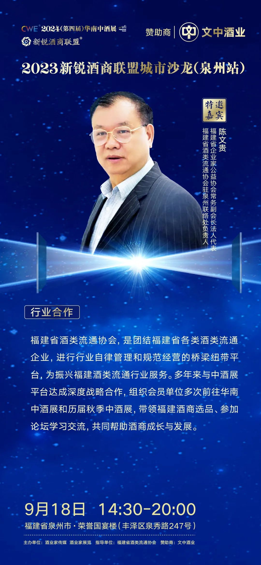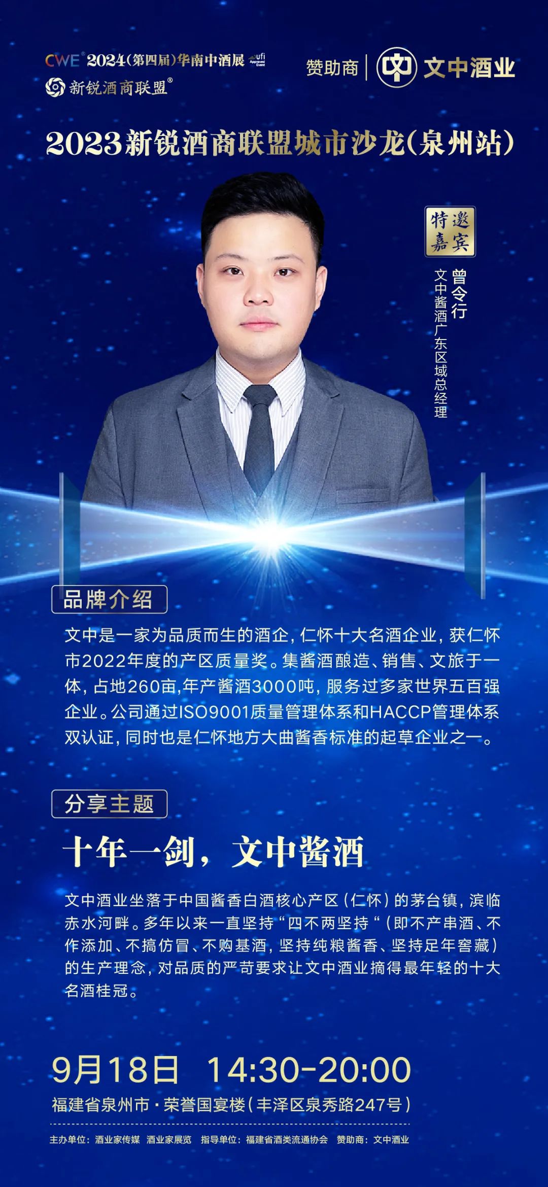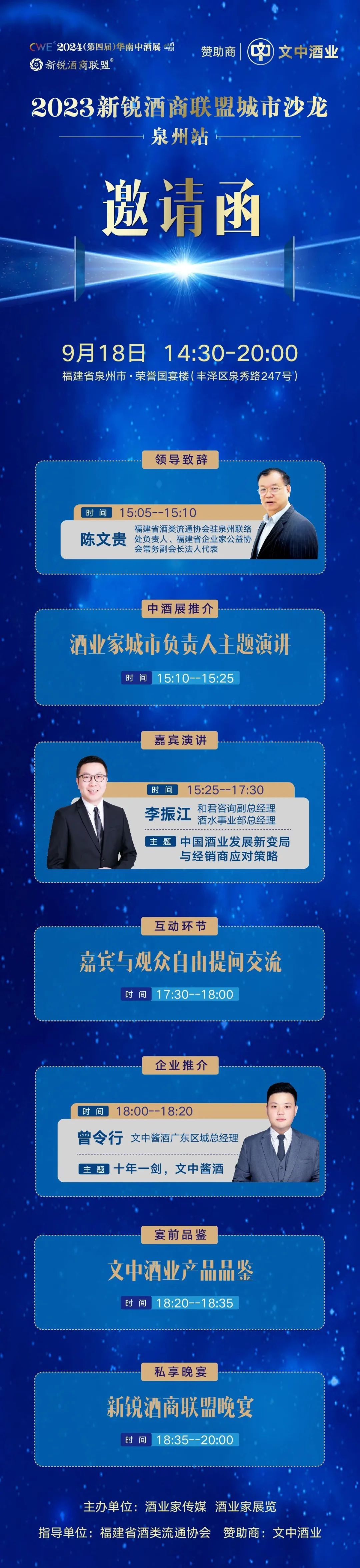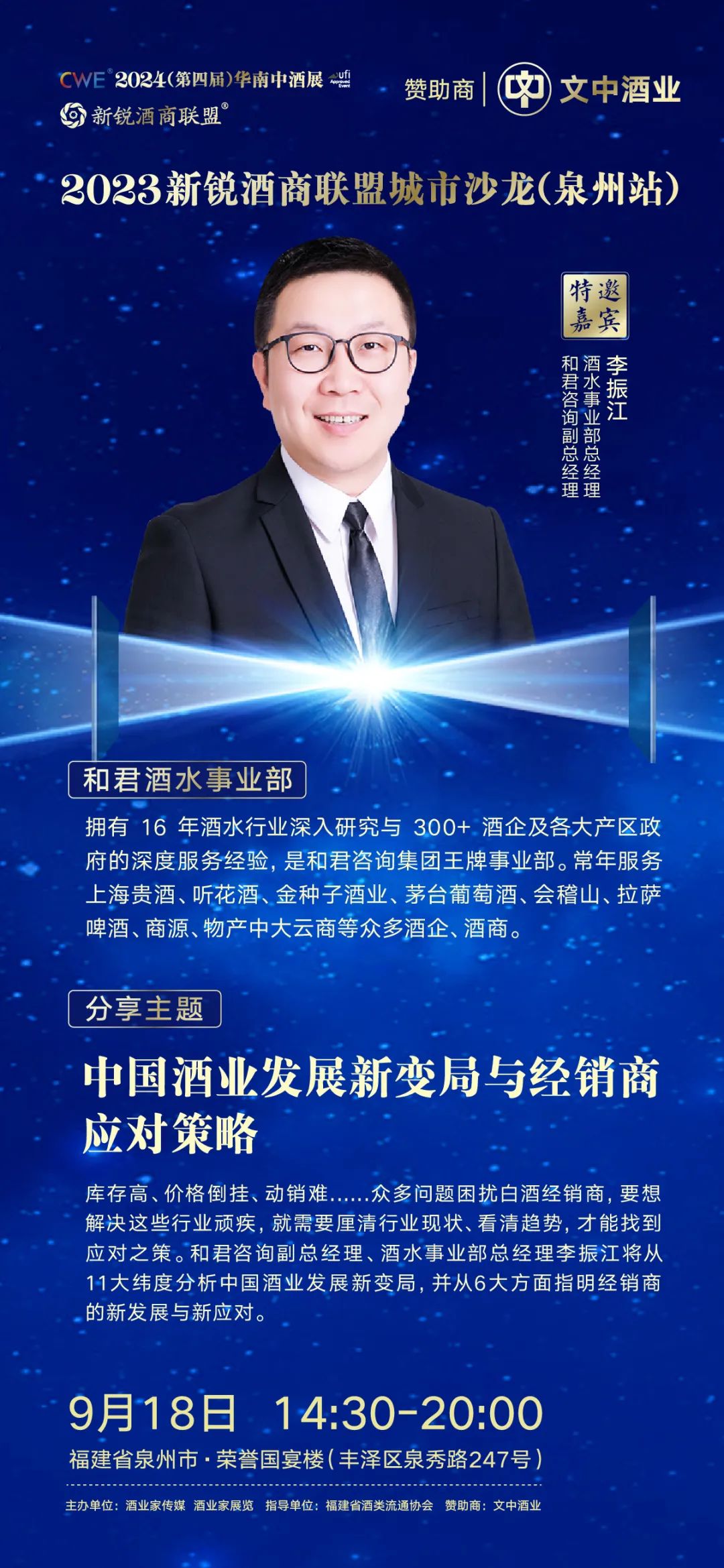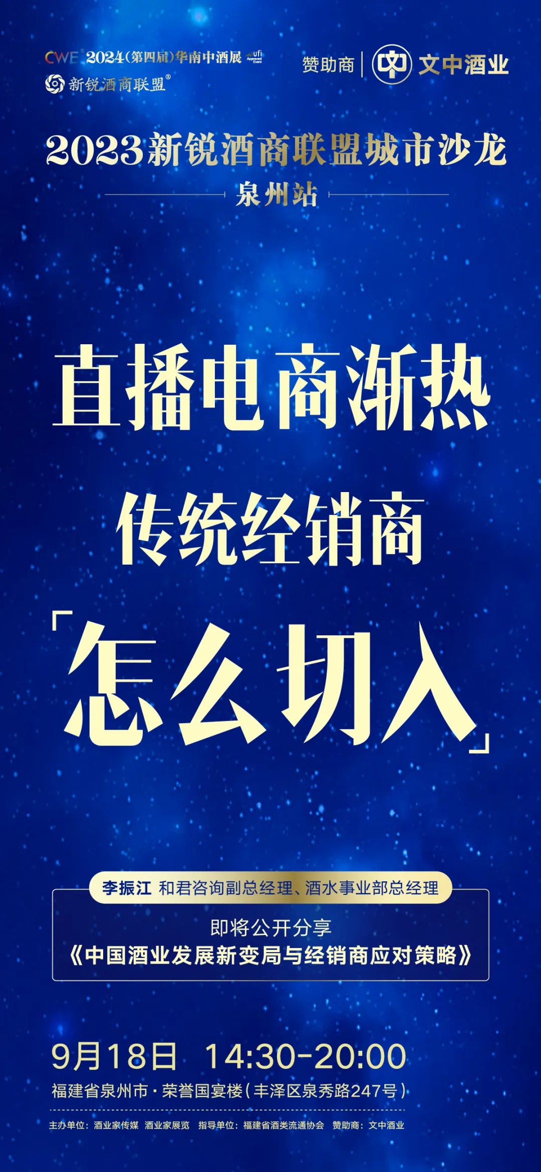 9月18日14:30-20:00,2023新锐酒商联盟城市沙龙将落地泉州,福建省酒类流通协会驻泉州联络处负责人、福建省企业家公益协会常务副会长法人代表陈文贵,和君咨询副总经理、酒水事业部总经理李振江,文中酱酒广东区域总经理曾令行等嘉宾与您相约泉州荣誉国宴楼(丰泽区泉秀路247号),一同看清酒业新变局,探寻酒商新增长。近日,由酒业家传媒、酒业家展览主办,文中酒业赞助的2023新锐酒商联盟城市沙龙(泉州站)活动流程出炉,既有多位行业重磅嘉宾参会,也有干活内容分享,还有现场美酒品鉴,精品活动席位有限,欢迎经销商踊跃报名。泉州市位于福建省东南沿海,是中国历史文化名城之一,同时也是白酒产业的重要基地之一。酒业家在走访泉州市酒类市场时发现,泉州市酒类市场,尤其是高端白酒市场潜力巨大。泉州优越的经济、人口及地理优势,吸引了茅台、五粮液、洋河等头部名酒争相入驻,外来名酒在泉州市场高占有率,也侧面印证了泉州酒类市场的开放性、包容性和商业潜力。繁华的经济和商业交流,也催生出泉州规模惊人的高端白酒消费市场,酱酒作为高端商务用酒的代表,在泉州市场的发展一路攀升,福建省酒类流通协会副会长兼秘书长汪庆璋曾表示,酱酒的销售主要集中在沿海地区,其中泉州就占了福建市场的1/3,中高档的白酒在沿海地区销量更大。有需求、有商机、有活力,2023新锐酒商联盟城市沙龙即将在泉州举办,与酒业人一起探寻泉州市场的新商机。由酒业家传媒、酒业家展览主办的新锐酒商联盟,一直以来都是全国酒类经销商们重要的学习交流平台,也用一场场干货满满的活动给经销商们带来了真正受益的知识和启发。本次泉州站的活动也将围绕酒商成长发展展开,帮助酒商分析当前行业形势,寻求酒业新时期的发展和经营之道。2023年已经过半,酒行业发展增速放缓,经销商们也面临着库存压力、资金压力、经营管理压力等,为了帮助酒商成功穿越周期,本次泉州站活动特邀请了和君咨询副总经理、酒水事业部总经理李振江作为泉州站的授课嘉宾。和君酒水事业部拥有 16 年酒水行业深入研究与 300+ 酒企及各大产区政府的深度服务经验,常年服务金种子酒业、上海贵酒、茅台葡萄酒、会稽山等众多企业,李振江也将带来主题分享《中国酒业发展新变局与经销商应对策略》。100-600元、1000元以上,哪个价格带的白酒能爆发出新机遇?酒业格局已经悄然发生变化,未来的厂商关系将如何发展?这些行业难点该如何破局,都将在现场一一揭晓。同时,李振江也将从酒商经营战略、平台模式、合作模式、转型升级、创新调整以及厂商合作等6个方面,为酒商提供6大应对策略,帮助酒商实现新增长。八闽大地,酱酒飘香,近年来,在茅台、习酒等头部品牌的带动下,酱酒在华南打开市场。随着高端商务需求的增长和消费者的追捧,泉州地区酱酒氛围逐步浓烈。数据显示,福建地区的酱酒消费占比已经达到20%,泉州则是福建省内的酱酒核心消费市场,市场机遇和前景可观。市场人士普遍认为,当下酱酒正在经历周期调整,但无论是高峰还是低谷,市场机遇一直都存在,相较于此前高歌猛进、跑马圈地,当下那些注重品质、稳健发展的企业脱颖而出,成为市场的新宠。文中酒业就是这样一家坚守“细火慢熬”的品质主义者,2011年文中酒业正式踏入酱酒行业,“文中”二字源于王氏家族为纪念家族事业开创者王文中老先生。文中酒业以品质匠心作为企业生存之本,制定并坚守“四不两坚持”的生产原则,即“不产串酒、不作添加、不搞仿冒、不购基酒;坚持纯粮酱香、坚持足年窖藏”,十多年来的守正创新,不仅让文中酒业挺过2013-2016年的行业调整期,还在逆境中不断向上发展,年产量逐步从1000吨增长到目前的3000吨。2022年,文中酒业荣获中国酱香白酒核心产区(仁怀)“十大名酒”荣誉称号。十年的坚守,赢得了荣誉和市场的肯定,文中酒业也迎来了全新的发展阶段。酱酒中场,属于“细火慢熬”的品质主义者。“熬”出品质与品牌的文中酒业,在这一波酱酒周期中同样不畏巨浪,逆势前行,以更加自信和沉稳的步伐,沉下心做市场、做品牌,与广大经销商一起赢战酱酒黄金赛道。9月18日14:30-20:00,2023新锐酒商联盟城市沙龙将在泉州市荣誉国宴楼(丰泽区泉秀路247号)如期举办,精品活动,为经销商们营造一个良好的学习、交流、分享的平台,席位有限,欢迎经销商们踊跃报名。