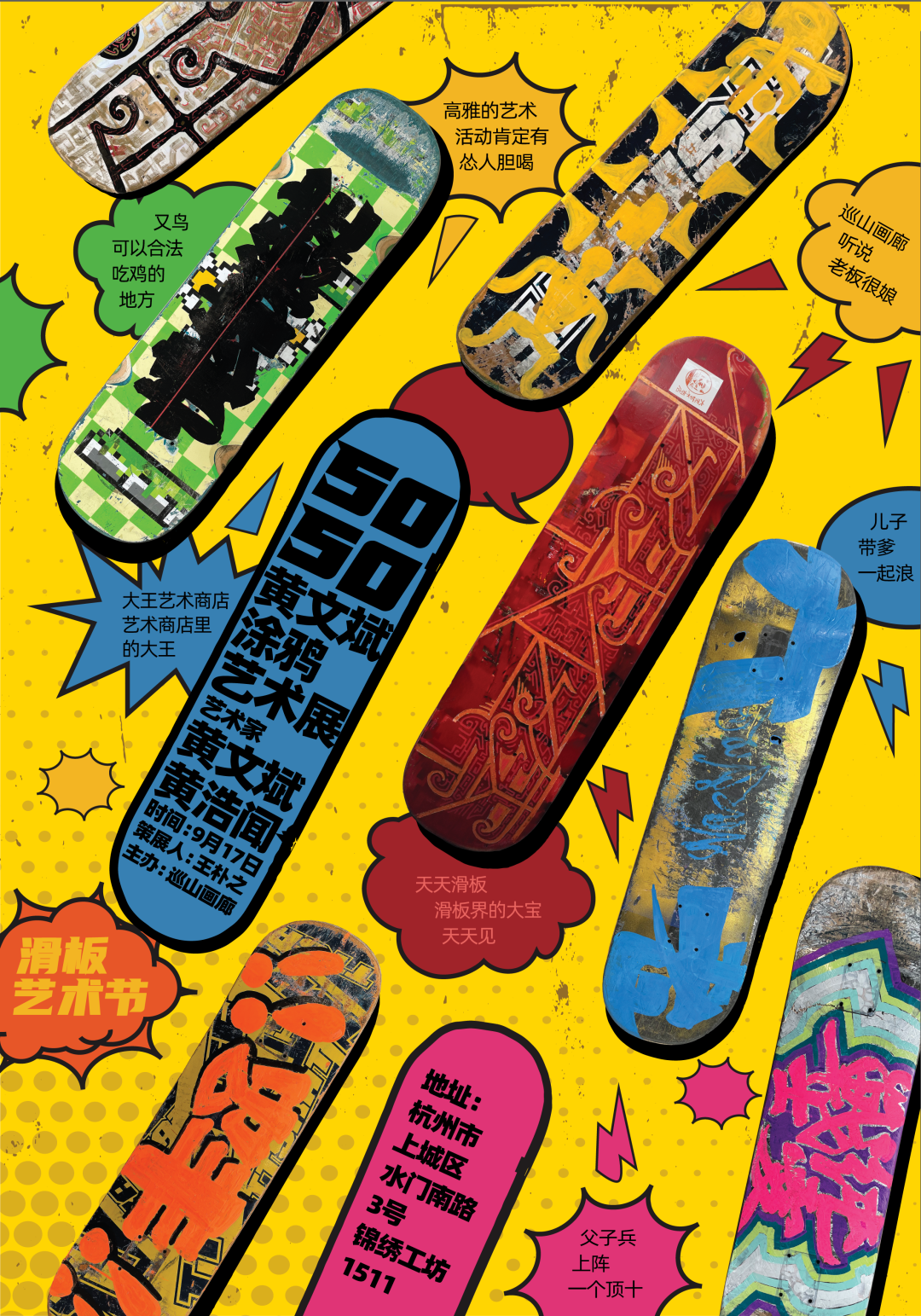 滑板是一个造型别致的创作空间,向来不缺与优秀艺术家的碰撞。作为生活中最容易接触到的极限运动之一,滑板独立、反叛、挑战的精神吸引着所有人,也颇有不少知名品牌制作了大牌艺术家的联名板面:草间弥生、玛格丽特、杰夫昆斯、巴斯奎特、安迪沃霍尔……而黄文斌老师在五十岁的时候与滑板结缘了,这是大家无论如何都没想到的。当然,这项缘分主要归功于他的儿子浩闻,滑板少年实际上濡染了他的父亲。虽然黄老师的体能和运动热情尚不足以支持他站上滑板,从身体上真正地极限起来,但他以滑板为媒介进行创作,思想意识无疑从一开始就在不断突破。展览主题挪用了滑板术语中的“50-50”。这是滑板中一个代表性的动作类型,常见的就是卡双桥(50-50 grind),也就是处理道具时前后两个轮轴都在道具上摩擦行进的动作,当然也能够见到特殊的玩法,比如卡斯珀(50-50 casper)就是将两只脚各放在一个桥上,将板的一头指向天空的花式——大概50-50可以泛指前后两个桥都有介入、平衡使用的动作类型。我将它作为展览的主题,是因为50-50在滑板语境之外可以衍生的意象相当丰富。这个等量二分的数字组合令人尤其喜欢,它似乎象征着一种平衡、全面的视角。就像陆游说的“功夫在诗外”,艺术家不该一头栽进所谓的艺术里,而应当一只脚踏在艺术之外,应当在贴近或者远离生活的任何地方保留对未知领域不确定性的好奇。大家都称呼黄文斌为“黄老师”。的确,黄老师19岁拿了全国性的书法大奖,年少成名,艺海戏浪也已三十余载。但反过来说,黄文斌如果就应该是“黄老师”,那么我们虽然从观众的角度规范了黄老师艺术的高位,却自我限制了展开想象的路径。诚然,这个时代平面化的趋势也辐射到大家对艺术的态度,一个成熟的艺术家似乎生来便以某种成熟的作品面貌示人,也该一直这样下去。但当今年50岁的黄老师打破一些习以为常的惯性时,我们惊奇地发现“原来这样也可以”!滑板作品创作了数十件,其中一部分很特别,是黄浩闻单独创作或是父子联合创作的。黄浩闻关注网络兴盛时代的流行文化,使用的语言和图像年轻、生猛。父子两代人文化趣味迥异,呈现出相当精彩的碰撞与火花。黄老师的创作过程应该有一种极限运动般的快感。他将歌词、门神、网络词汇以高对比、高饱和的视觉样式进行呈现,将板底无数的擦碰痕迹收束到展厅的时间线。虽然黄老师创作的视觉基础与审美趣味很大程度上来源于书写和纹饰,但我们可以明显地感受到他在创作过程中主动消解了自己作为书法家的身份与义务,以一个图像制造者的角色面对滑板具体的平面空间,似乎用一种幽默、快速、当下的方式,将自己也赋予了滑板运动的极限精神。从数量上来说,作品大部分是黄老师创作的,但浩闻贡献了展览中相当重要的、极具挑战性的部分。年轻人的创造存在一种特殊的强势,这种强势源于他们只对自己的审美和感受负责——这在经过长期规训的专家身上是很难见到的。许多令人惊喜的创造来自浩闻的“导演”,比如第二展厅中的教室黑板,它指向一种艺术生产与媒介交换的场景,又比如第三展厅那些网络世界中有关情绪表达的词汇,有着切入这个时代的鲜活。黄浩闻带着年轻人的观念强势进入父亲的领地,以特属于这个时代年轻人的戏谑法则、以积极的虚无主义,对这个世界欲行抵抗。黄老师平日里的主要工作是在书斋中伏案进行的,此次展览与平常的不同在于,黄老师主动将创作实践与展览空间联合得更为紧密。展览能够带给我们的绝不止视觉上的启发,它应当引发关于时代、媒体、代际等等的诸多思考。把艺术转换过程呈现在大家面前的黄老师,正如博伊斯所激扬的艺术行动那样,像魔法师般使物质焕发出生机勃勃的艺术性。某种程度上,艺术和滑板似乎是同位的:它们有力、真实,人人都可以参与,同时又极富挑战。于是黄老师父子俩将创作的过程与痕迹诚挚地展现出来——无论对创作者还是观众,这都是最真实的美妙体验。