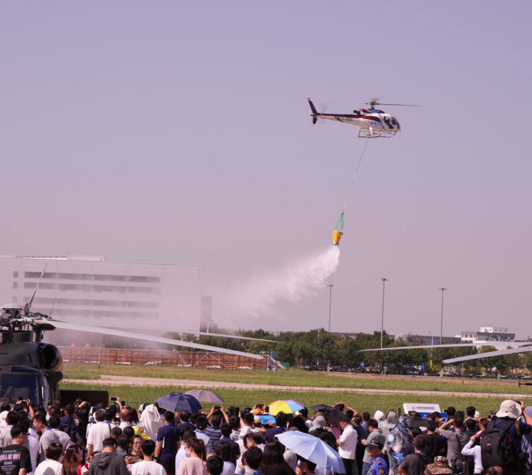 开幕式上,航空工业研制的6型18架直升机整齐出动,共舞苍穹,为现场观众带来一场专属直升机的空中视觉盛宴,精彩绝伦的表演让现场观众掌声不断。航空工业研制生产的AC352、AC312E紧随其后,先后进行编队飞行,AC311A也进行了吊桶悬挂作业演示,突出展示了航空工业AC系列民用直升机的优越综合性能,彰显了国家应急救援硬核装备的专业能力。