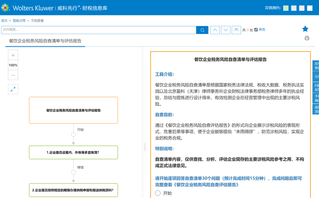 该清单以威科先行的智能决策工具发布,以智能化及便捷化的方式帮助企业进行税务健康体检,提供风险等级和风险分析评测,帮助企业利用风险清单逐项排查税务风险点,提高企业税务合规质量,规避法律风险。