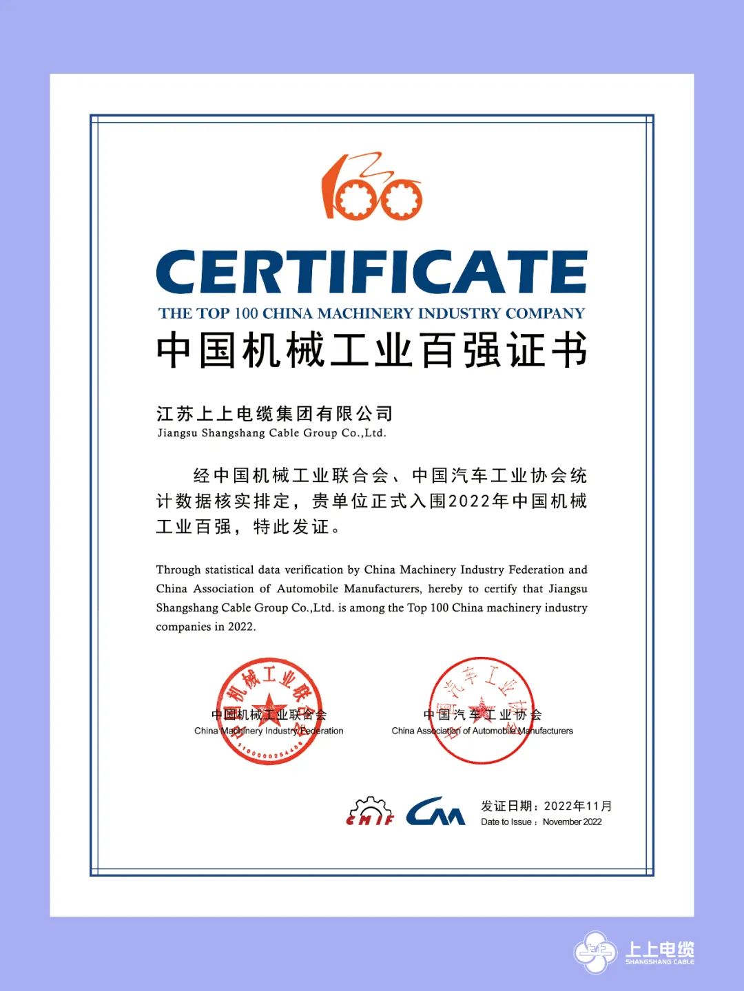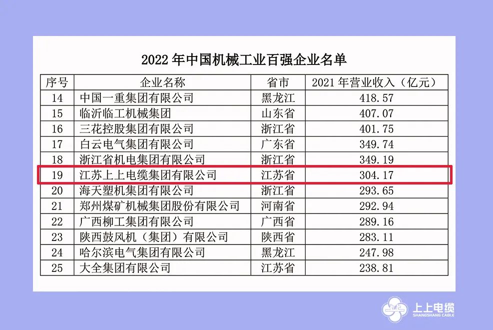 12月28日,由中国机械工业联合会、中国汽车工业协会联合主办的第十八届“中国机械工业百强和汽车工业整车二十强、零部件三十强企业信息线上发布会”在京召开。会上揭晓了2022年中国机械工业百强榜单,江苏上上电缆集团连续18年入选,位列第19位,较去年提升了3位。