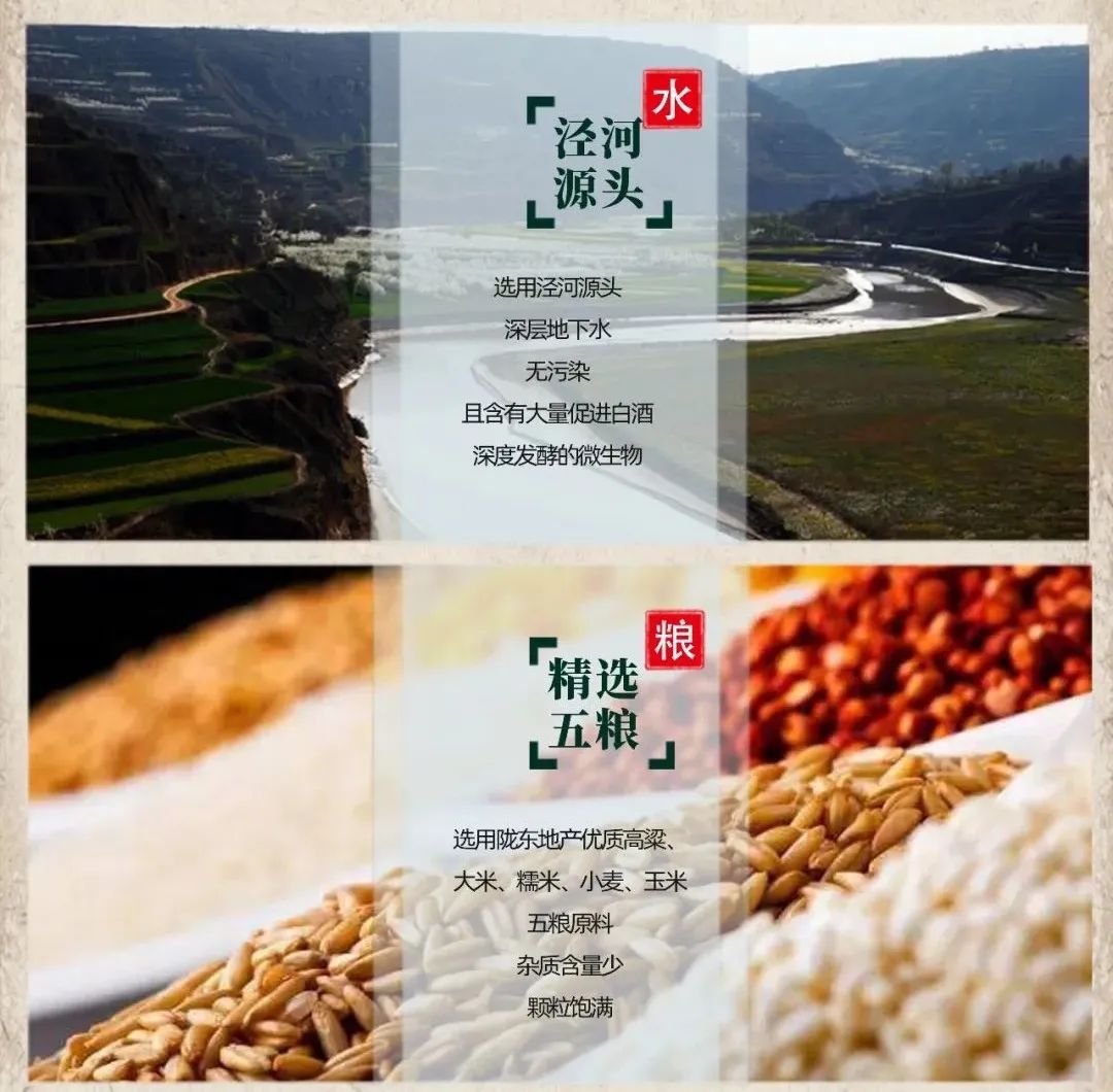 崆峒酒对酿酒原料的产地严格要求,选用泾河流域天然绿色、无污染的高粱、小麦、玉米、糯米和宁夏黄河流域出产的优质大米,精挑细选,确保所有原粮色泽纯正、颗粒饱满,各项理化指标完全符合行业标准规定。崆峒白酒凭借科学的五粮配比和优质的原料保障,逐渐形成了自有的色、香、味和质量风格,让一瓶瓶高品质的崆峒白酒走进千家万户。