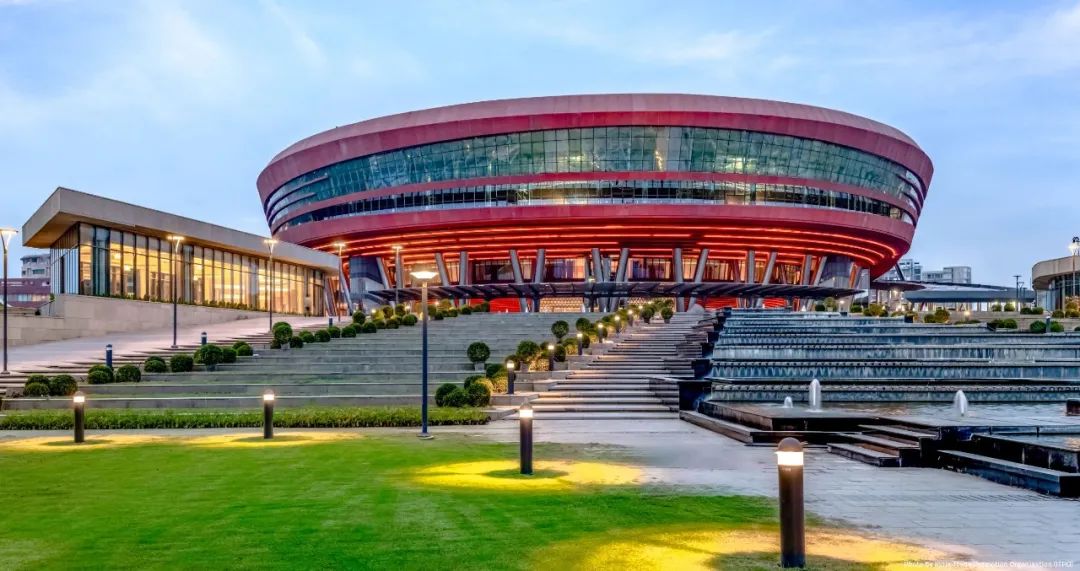 国际会展中心由Aedas 、Arcop Associates 联合体共同设计,团队将总面积123.5英亩的地块重新规划,为新德里打造出世界级场馆,并为城市提供了超100,000平方米的展览空间,以及可容纳13,500人的会议中心。A joint Venture with Arcop Associates, Aedas designed the 123.5 acres site which was re-planned to design a world-class venue for the city. Known as the International Exhibition & Convention Centre (IECC), the project will provide over 100,000 sq m of exhibition space with a Convention Centre at a planned capacity of 13,500 people.项目作为当代印度的标志,展现了该国对未来的期许。团队尊重印度的建筑传统,将公共建筑以及市政建筑中常常使用的圆形几何图案融入设计,并就地取材,在建筑中使用了水、阶梯式空间以及柱廊这些文化符号,结合传统色彩搭配,构建出古典与现代相结合的国际会展中心。The Convention Center was designed as a contemporary Indian icon, showing the nation’s approach to its future while respecting timeless Indian architectural traditions, such as the use of circular geometry for buildings of public and civic importance, the integration of water and stepped public spaces, colonnades, use of ancient symbology, plus locally sourced materials and traditional colours.