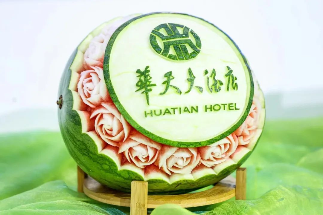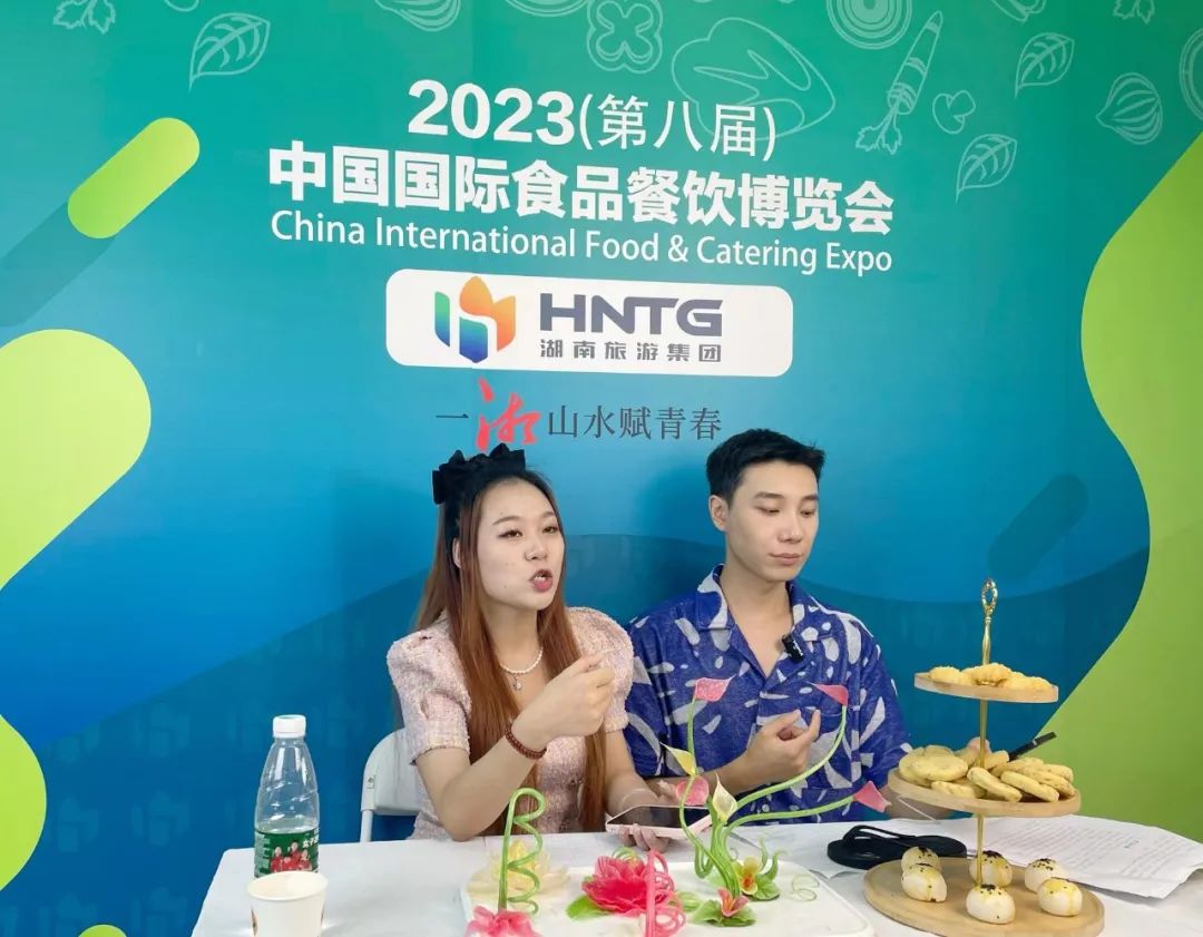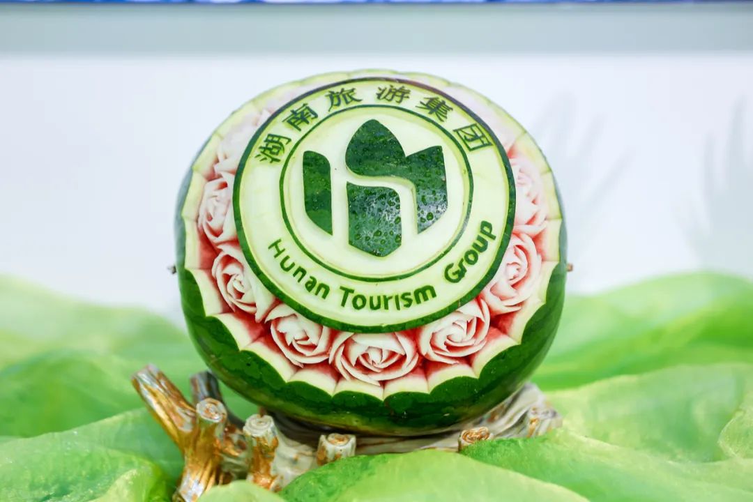 “湖南旅游集团展馆内特设有‘宴席大菜、中西式点心、预制菜品、巴西烤肉’等美食打卡品鉴区,提供十余道湖湘名菜展览及中式糕点、烤肉现场品鉴。”湖南旅游集团的工作人员介绍道。旗下华天酒店集团的厨房师傅用精湛的雕刻技艺,将湖南旅游集团和华天酒店集团的徽标雕刻出来,将企业文化与传统技艺相结合,完美的展示企业形象,营造出浓烈的烟火味和别样的美食体验。