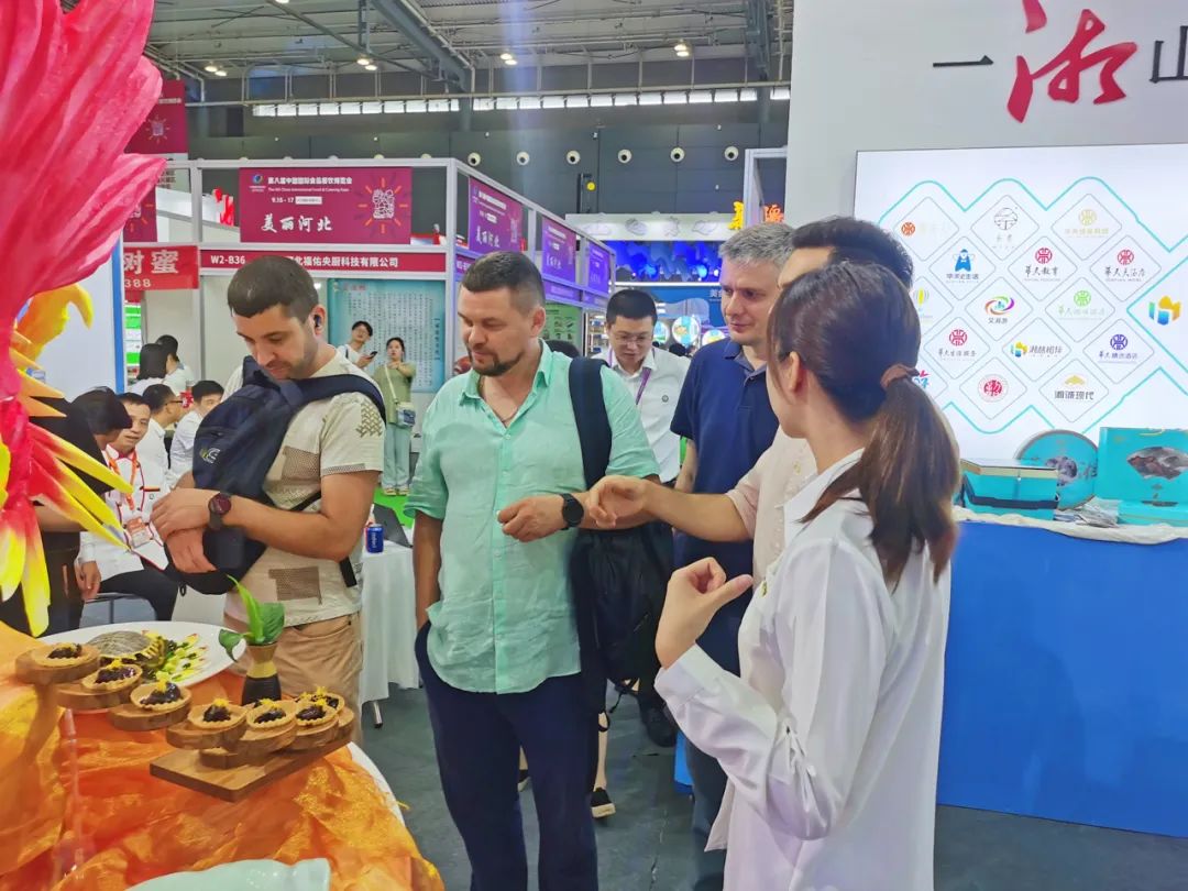 "Welcome!”现场不仅吸引了广大市民及游客朋友,更吸引了众多海外友人前来参观。在湖南旅游集团展馆内,外宾朋友对华天酒店集团摆盘精美的宴席菜产生了浓厚的兴趣。“这些中国菜真漂亮!都是你们厨师制作的吗?”来自北美的外宾朋友用手机快速记录下眼前精美的一幕,时不时向华天酒店集团的讲解员提问,并现场品尝了华天酒店集团的国潮月饼,他们纷纷为华天月饼点赞:“月饼馅料很多,甜甜的,非常好吃!Good!”