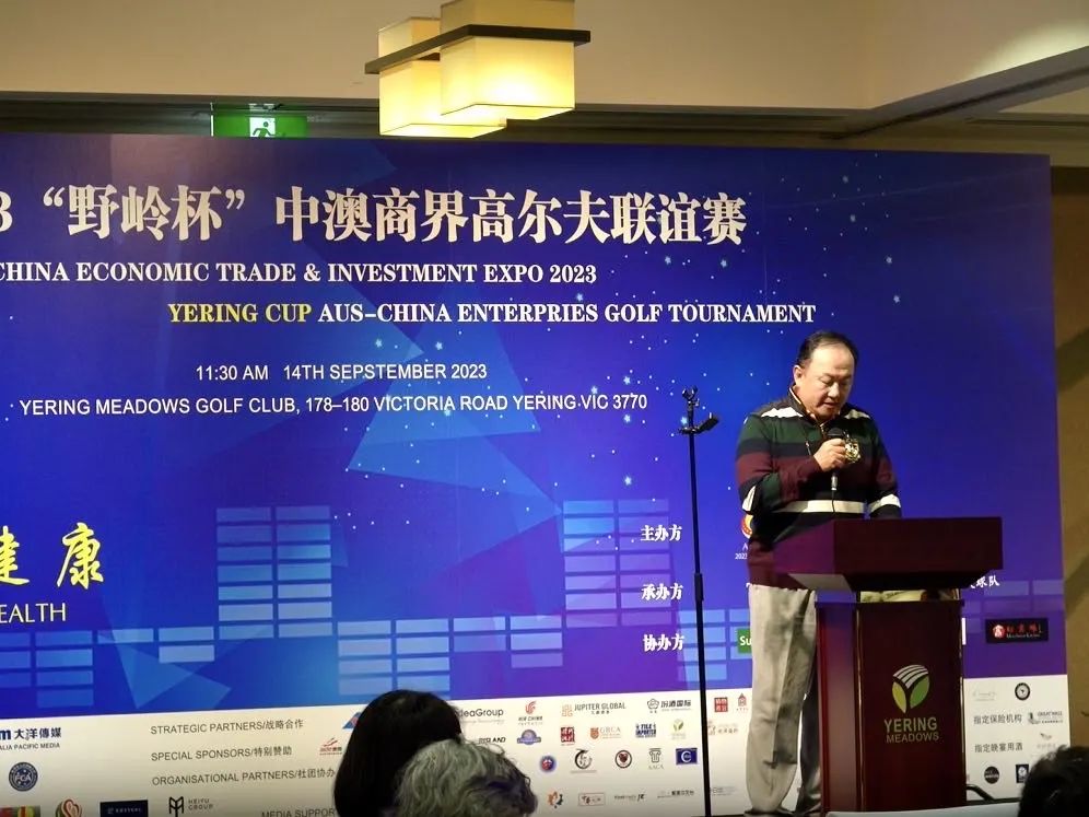 紧接着,活动承办方凤凰高尔夫球队队长胡小军(Ronald Hu) 上台致辞,他表示,澳中博览会是文化交流的桥梁。在澳中博览会正式开幕前举办高尔夫联谊赛是一直以来的传统,希望这活动能够给寒风中的澳中关系带来改善。