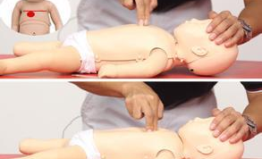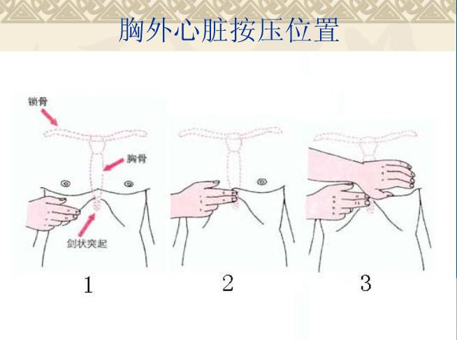 (1)按压部位:找准患儿两乳头连线中点部位(胸骨中下段),用一手掌根部紧贴患者胸骨,另一只手叠放在该手上,十指交叉,双臂伸直,且双臂位于患者胸骨正上方,也可单掌操作。