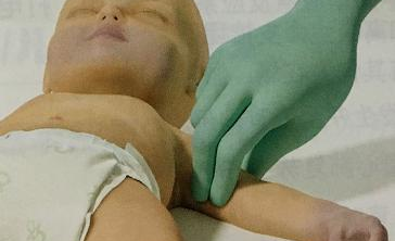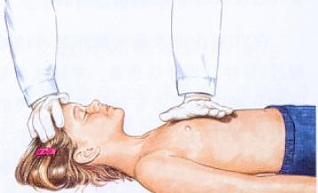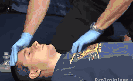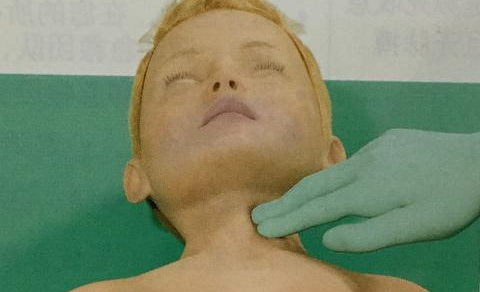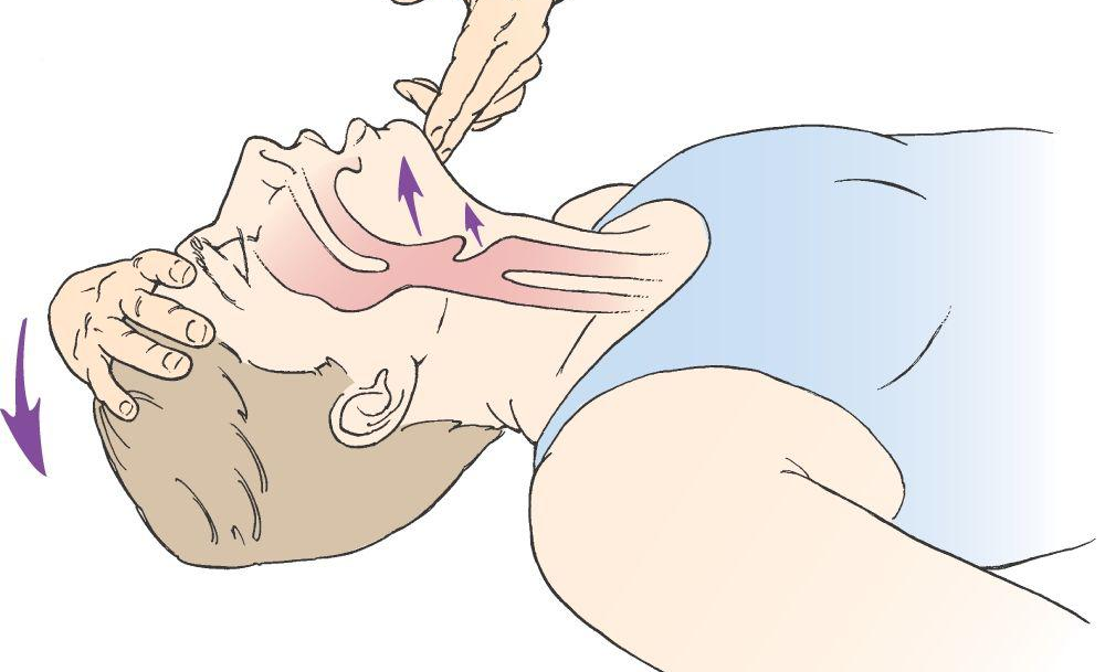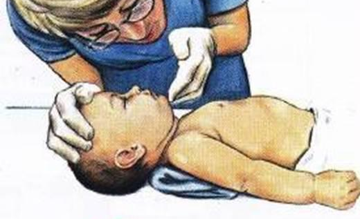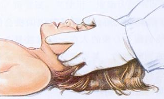 (2)推举下颌法(颈部损伤):双手从两侧托起患儿的双下颌,使头后仰,下颌骨前移,即可打开气道。