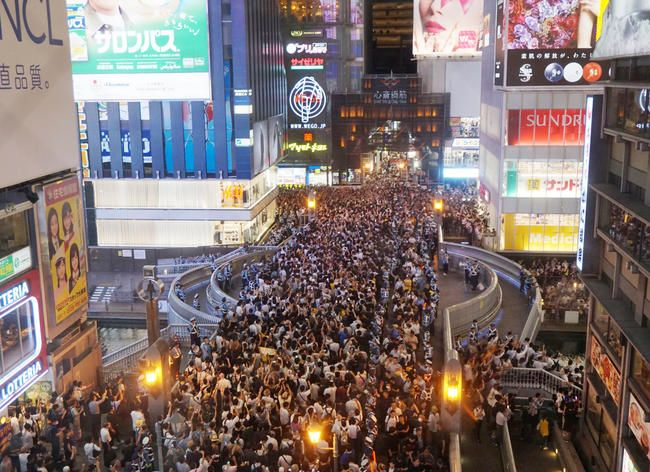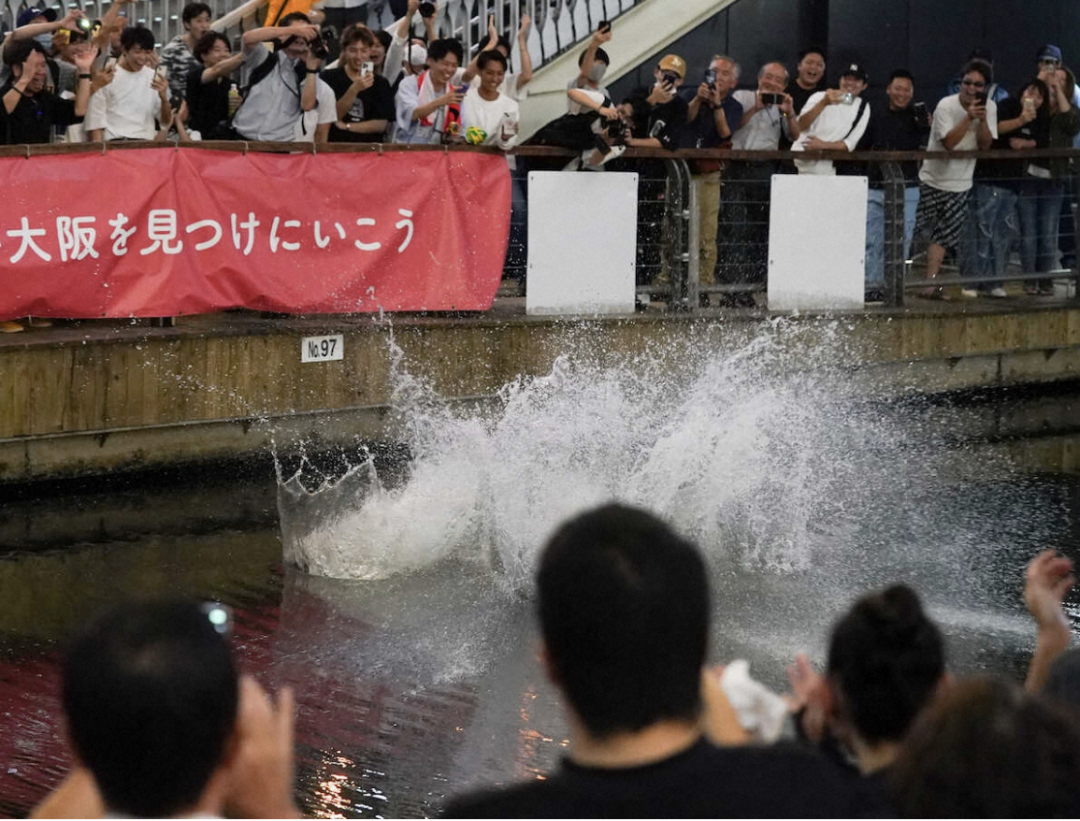 虎粉庆祝胜利刺激的传统方式:粉丝跳进大阪市中心的道顿河。