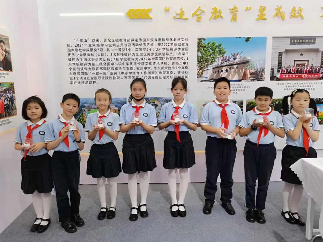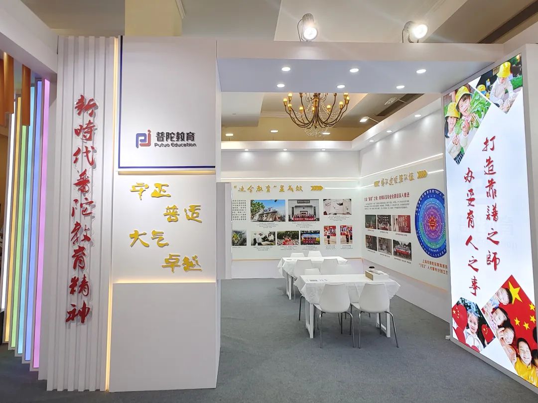 普陀教育展台位于区域教育展区,围绕“培根铸魂育新人”“幼有善育树品牌”“优质均衡谋特色”“多元发展高质量”“梯队建设强队伍”“适合教育显成效”六部分进行展示,全方位展现近年来普陀教育在“为每一位学生学以成人、人生出彩提供适合的教育”核心理念的引领下,坚持立德树人、五育并举,学校办学条件不断改善、先进教师典型不断涌现,教育发展环境持续优化的成效。