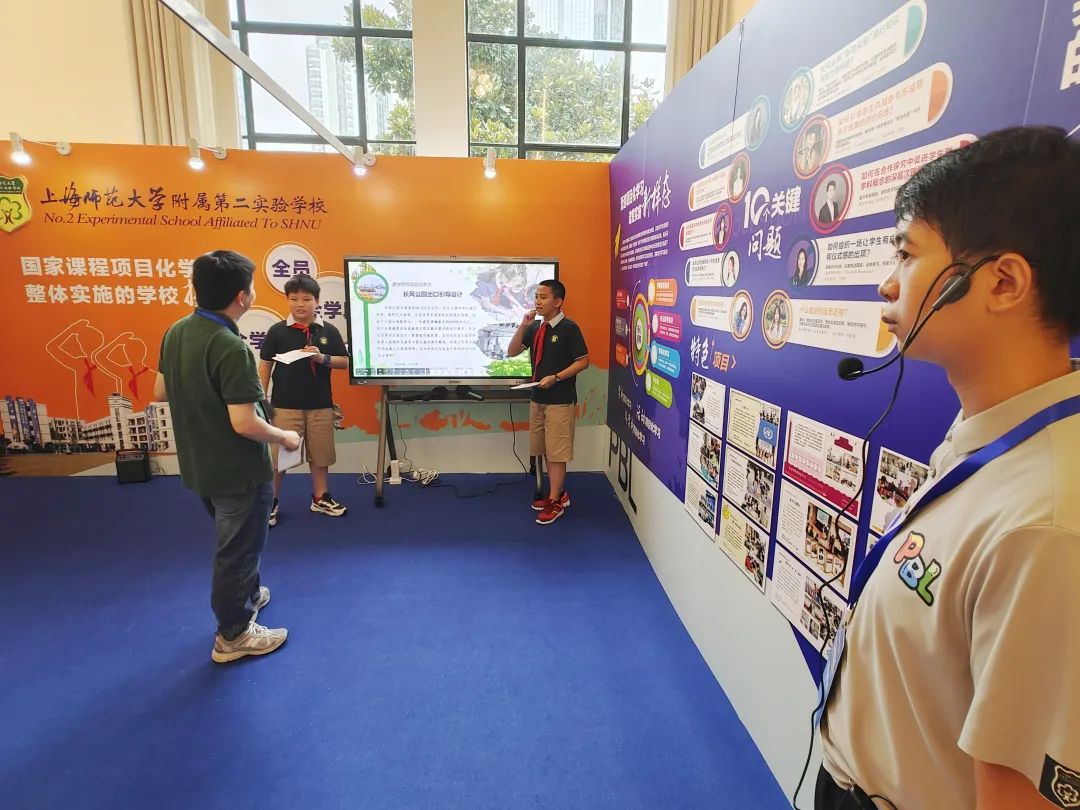 上海师范大学附属第二实验学校展台位于上海“家门口的好学校”展区,该展区集中展示义务教育阶段中小学校高质量发展的新面貌。作为上海市义务教育项目化学习三年行动计划(2020-2022年)种子实验校,上师大附属二实验学校通过“学校整体介绍”“项目化学习介绍”和“互动体验”三大板块,展示了办学理念、办学目标、基本概况,以及最新发布的毕业生形象设计,反映了学校多年来在课程改革等方面积累的经验做法。“这是我们参与长风公园出口引导设计的一系列调研过程和成果。”在展厅现场,二实验学子通过图文展示、现场讲解等方式,向参观者介绍项目化学习的成果。
