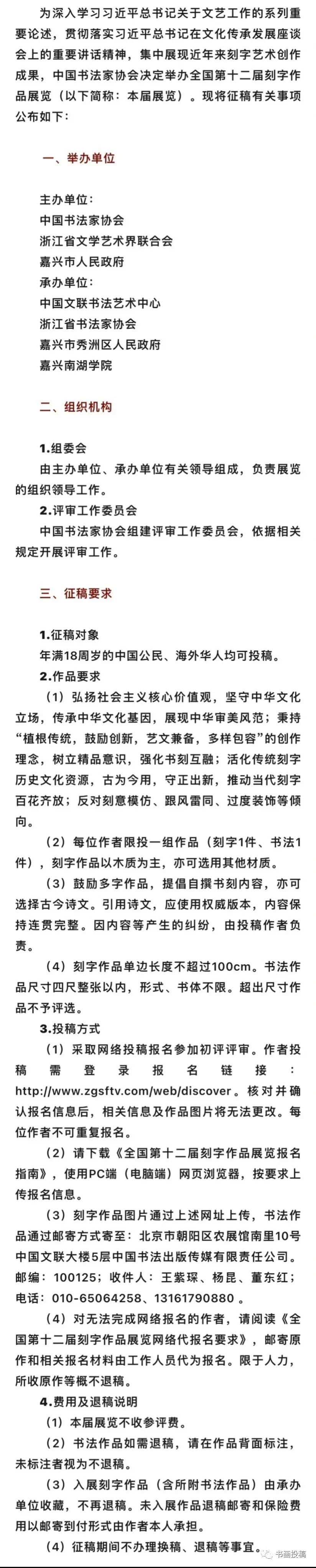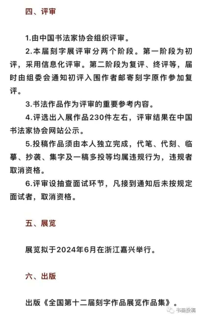 2.向入展作者赠送《全国第十二届刻字作品展览作品集》1册。5.本届刻字展入展作品参加全国第十三届书法篆刻展览终评。6.全国第十三届书法篆刻展览刻字类入展作者须复刻入展作品1件交由全国第十二届刻字作品展览承办单位收藏。7.收藏费、入展证书、展览作品集将在开幕式之日起90个工作日内由相关单位向入展作者支付和邮寄。自本启事公布之日起开始接受网络投稿报名,至2023年12月15日24:00截止。逾期报名不予受理。1.为维护展览的严肃性和权威性,中国书法家协会将加大对违规行为的查处力度,举报长期有效。举报要求事实清楚、证据确凿。举报材料请寄:北京市朝阳区北沙滩一号院32号楼B座9层中国书法家协会机关纪委办公室。邮编:100083。电话:010-59759587。2.投稿作者特别许可如下权利:举办单位对参展作品享有展览、出版、宣传、信息网络传播、研究、摄影及录像等权利,对入展作品和不退稿作品享有相关法律法规规定的各项权利。收藏方对收藏作品还另享有相关作品原件的完全所有权及展览权等权利。以上许可均无需另行支付前述收藏费以外的任何费用。3.收稿及评审期间,作品原件历经拆封、登记、摆放等环节,或遇突发情况、不可抗力因素等,可能导致作品原件损伤,请投稿作者谅解。4.投稿作者一经投稿,即视为完全接受本征稿启事全部约定或要求。所有来稿应当符合本启事各项要求。