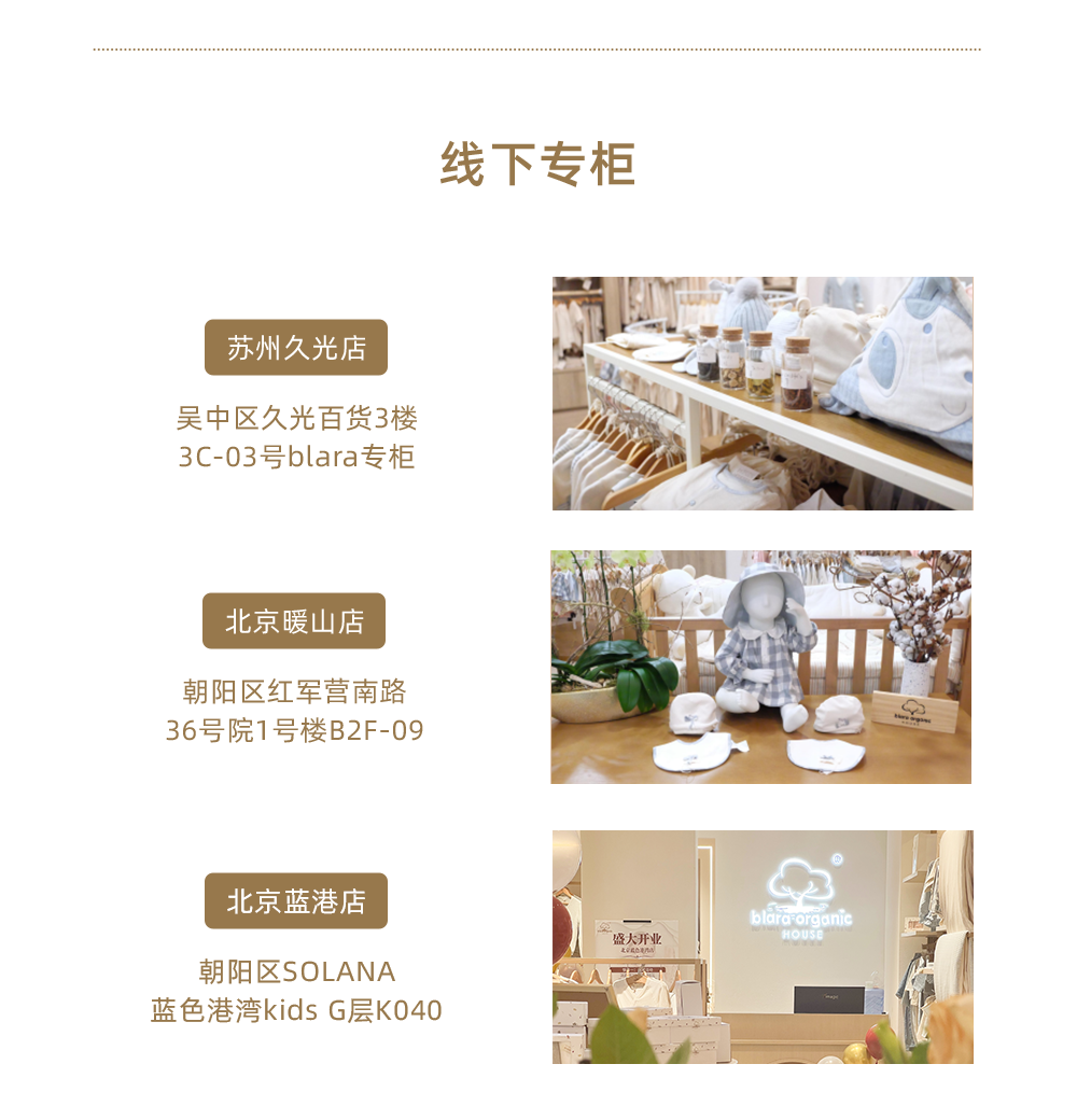 品牌以“有机环保服饰”为产品主题,追求自然有机环保面料与健康舒适的体验,坚持选用GOTS认证、GB认证的有机棉花,坚持纯天然植物染色。