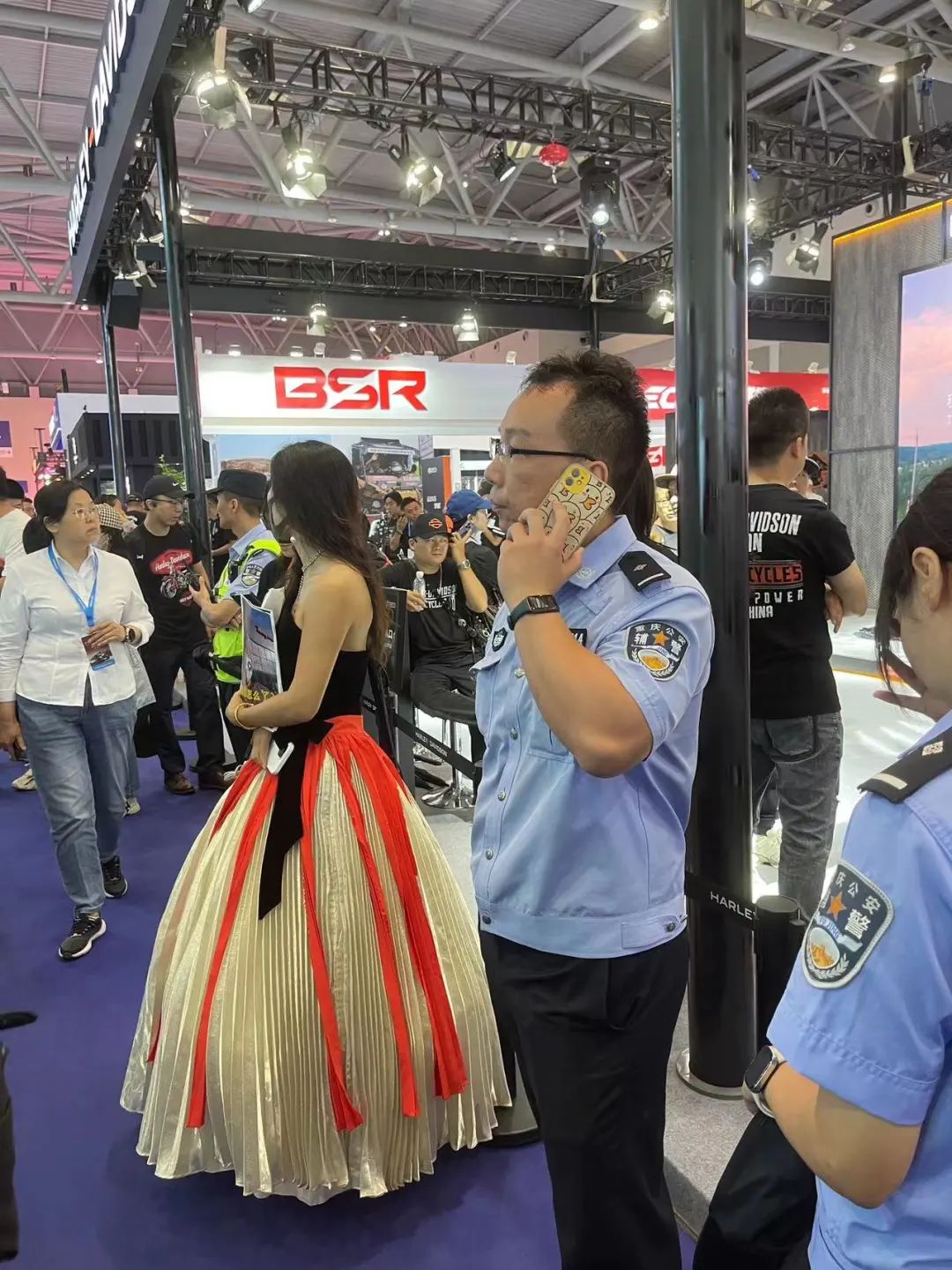 今年五月曾经在北京摩展上展示维权标语的那位“婚纱横幅”姐姐,今天又来到了重庆摩展的哈雷展台,似乎想要借助于这样一个高人气的展台,再次展示她的诉求。