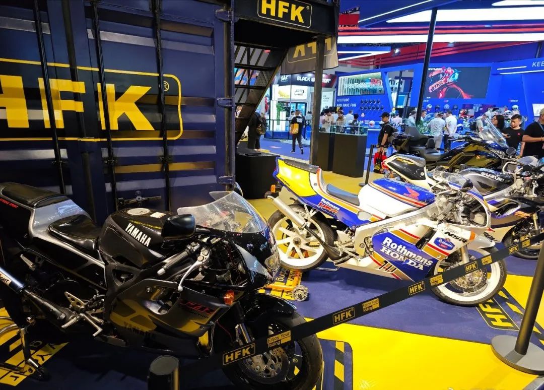本次摩展现场,HFK展台颇具看点,HFK老板可以说是拼了!把自己的的私人收藏的摩托车型都搬到了展台上,从展示的车型来看,老板属于日系资深老粉丝,还真是凸显品味的一种方式。