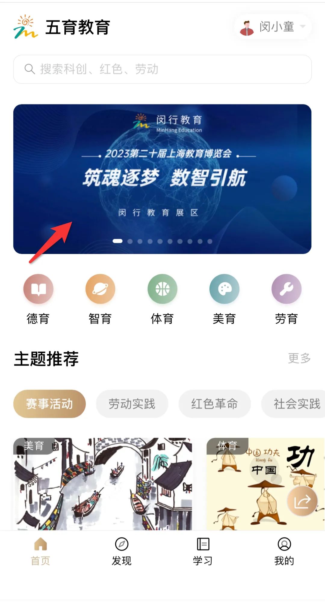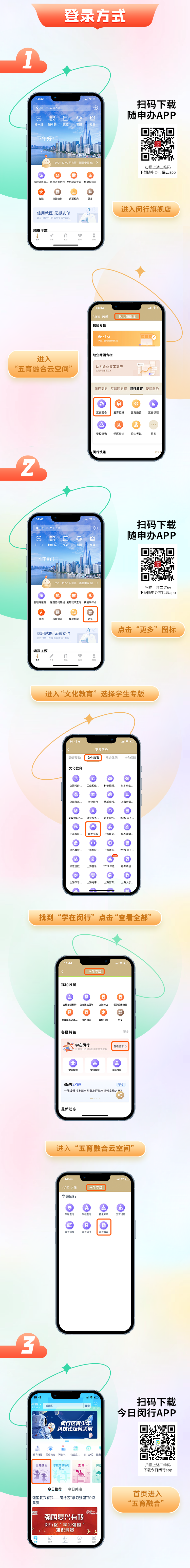 打开随申办APP、今日闵行APP或微信/支付宝随申办小程序,进入五育融合云空间,点击首页海报,进入活动页面。