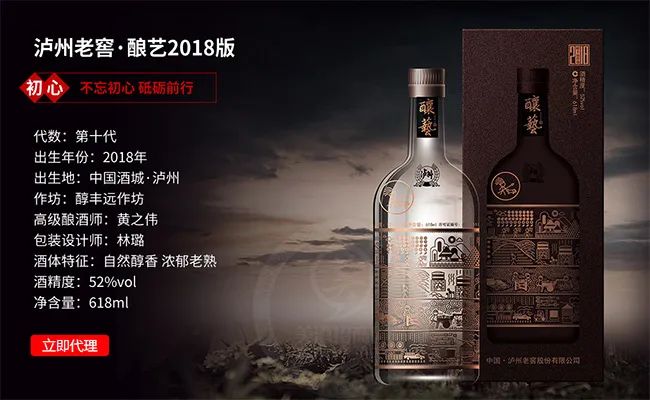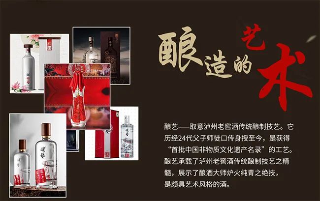 酿艺——取意泸州老窖酒传统酿制技艺。它历经24代父子师徒口传身授至今,是获得“首批中国非物质文化遗产名录”的工艺,从命名上不仅可以产出产品的艺术感,而且还能感受到其卓越的品质。