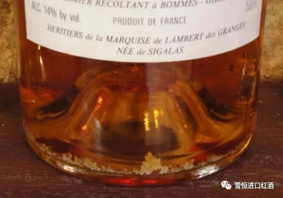 一瓶存放了一定时间的葡萄酒,在酒瓶的一边(卧放的酒)或瓶底的一边(斜放的酒),常会发现一些结晶体状的沉淀物。这些漂浮在酒中的沉淀物颜色较深,比重较大,使许多人误认为酒已变质而不敢再喝。其实,这些结晶是葡萄酒中的一些不稳定物质在一定的环境下生成的化学物质组成。其实,出现沉淀物正是葡萄酒成熟的标志。因为影响葡萄酒口味的不稳定物质已从酒中分离出来,从而使葡萄酒变得更加纯净,酒味结构更加稳定,口感也更加醇厚润滑。可以这么说,沉淀物的产生是葡萄酒整个生产过程中的一个必经阶段。