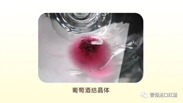 其实葡萄酒里面出现结晶并非质量问题,它不仅没有害,反而是葡萄酒在发酵过程中和成熟过程中必定会产生的物质,是葡萄酒成熟的标志。在国外瓶子里的酒石有时候也是酿酒师优秀工作和葡萄酒优秀质量的标记。因为一般而言只有质量优质的葡萄酒才会有沉淀物即酒石。由于葡萄酒在发酵过程中密封的很好,葡萄酒芳香物质便被保护得很好。发酵过程进行得越慢,在桶里沉淀的酒石越少而装在瓶子以后就越多。