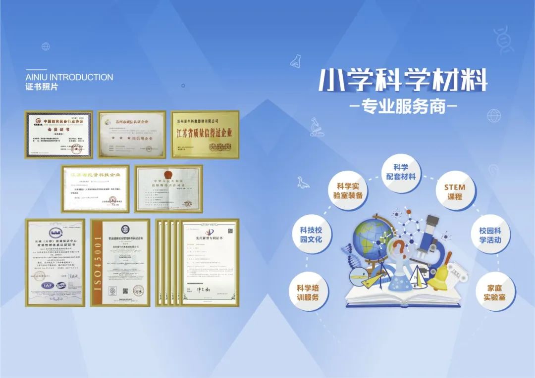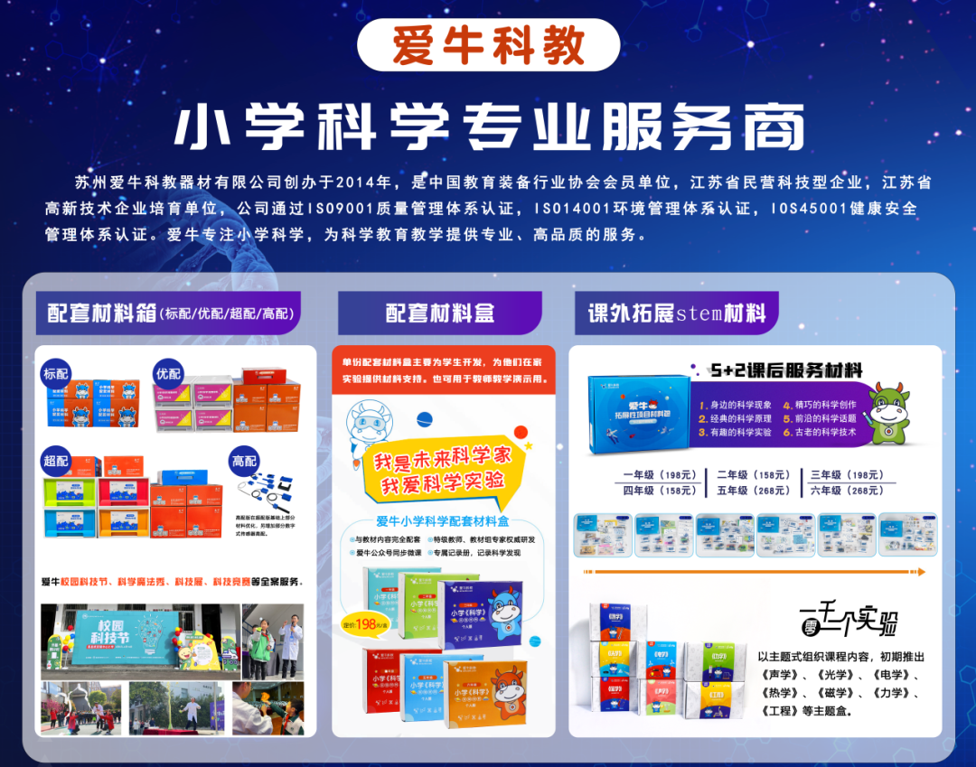 苏州爱牛科教器材有限公司创办于2014年,是中国教育装备行业协会会员单位,江苏省民营科技型企业,江苏省高新技术企业培育单位,公司通过ISO9001质量管理体系认证,ISO14001环境管理体系认证,ISO45001健康安全管理体系认证。爱牛科教是小学科学材料的专业提供商,我们专注于小学科学,为科学教育教学提供专业,高品质的产品及服务。