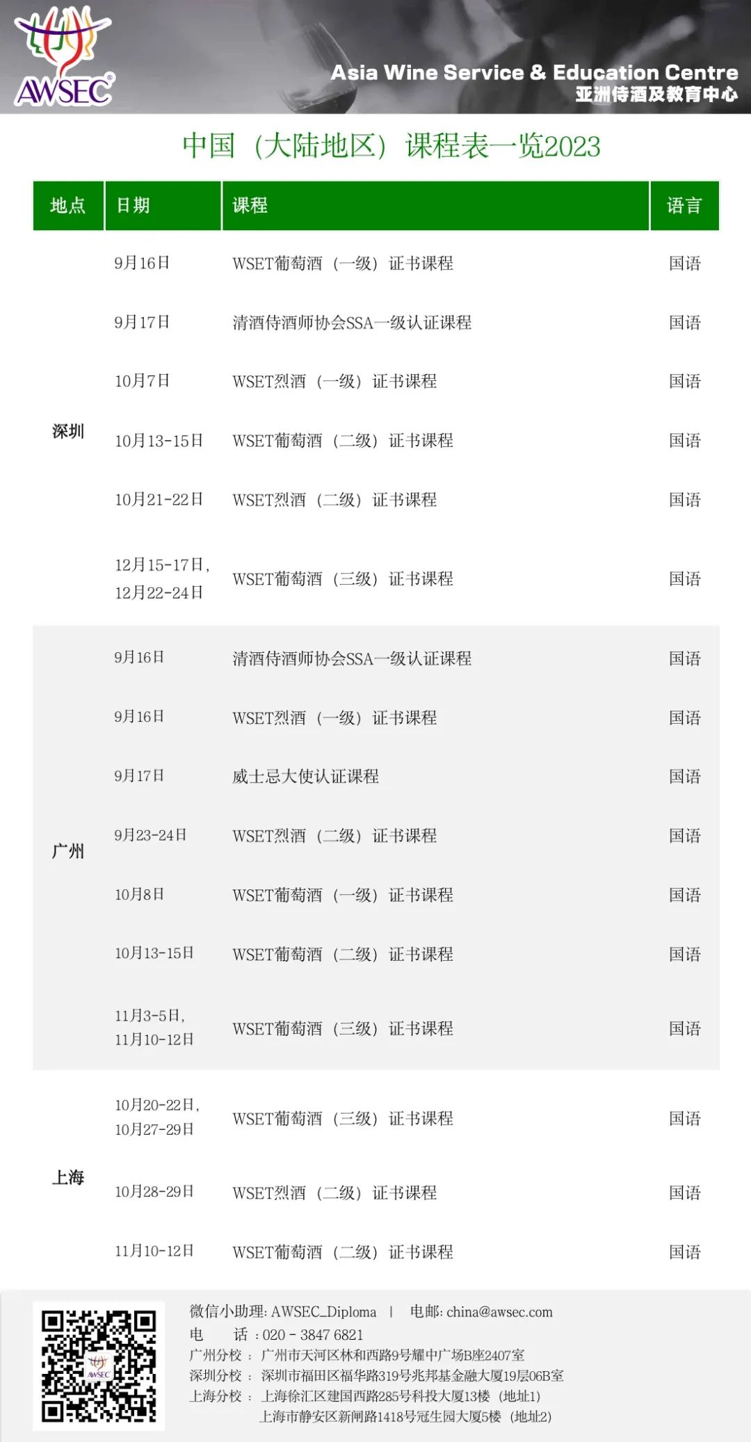 AWSEC是全国最悠久葡萄酒教育机构,全国有香港、广州、上海及深圳四个校区,课程遍布亚洲。近30年来一直坚持教学理念,提供专业的教育与服务。拥有一流的讲师团队,同时也是香港唯一及亚洲最大的WSET四级文凭课程教育机构,是亚洲第一家获得“WSET年度最佳教育机构”殊荣的机构,后来更获得“葡萄酒学者”最佳教育机构大奖,以及“意大利葡萄酒学者”最佳教育机构等多种荣誉。