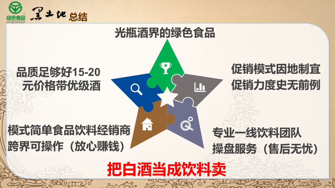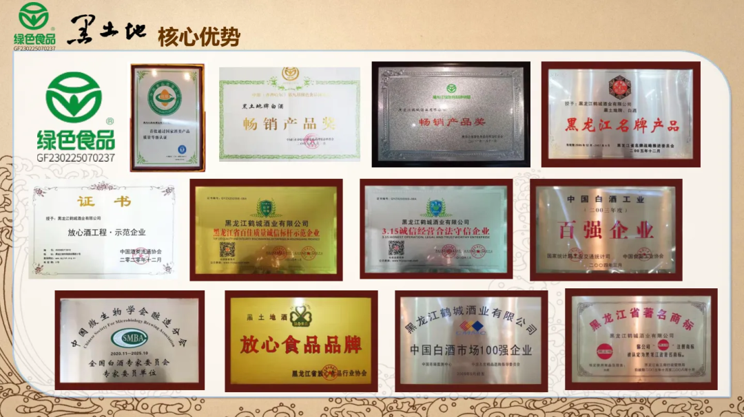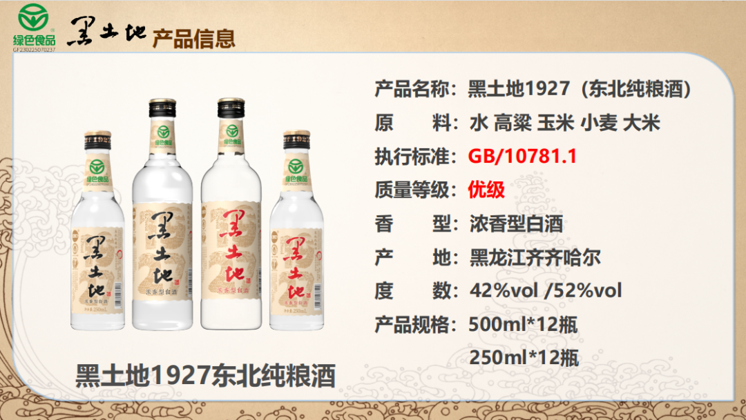 第一,作为百年名酒黑土地可谓名声斐然。黑土地前身为黑龙江国有企业,始创于1927年,解放前的 “永兴福”烧锅,至今已有九十余载的酿造历史,是中国白酒工业百强企业。2001年初,企业体制改革进一步深化,改制后股份制企业。现如今的黑土地是首批酒类获得国家绿色食品标志的酒企;是中国白酒市场100强企业;是中国白酒工业百强企业;是全国白酒专家委员单位;是第一个走出东北实现全国化的东北品牌……第二,黑土地把“国标优级酒”“国家绿色食品标志”作为其产品的两大标签,执行标准为GB/T10781.1(优级)。精选世界四大之一黑土地种粮基地特有的“大蛇眼”红高粱为主要原料酿造而成,其所生产的38°、42°、45°、52°黑土地牌白酒通过ISO9001国际质量管理体系认证,早在2004年便获得了首批中国绿色食品发展中心的绿色食品(A级)的认证。第三,“黑土地”1927终端定价位于20元核心价格带。采取“高质低价”的策略迅速抢占市场,推出了42%vol /52%vol,产品规格为500ml*12瓶和250ml*12瓶,满足不同消费场景用酒需求与不同渠道的铺货需求。并留出了足够的利润空间给经销商和终端渠道,卖上几瓶“黑土地”1927,抵得上一箱竞品的利润,哪位经销商能拒绝得了如此掘金利器!