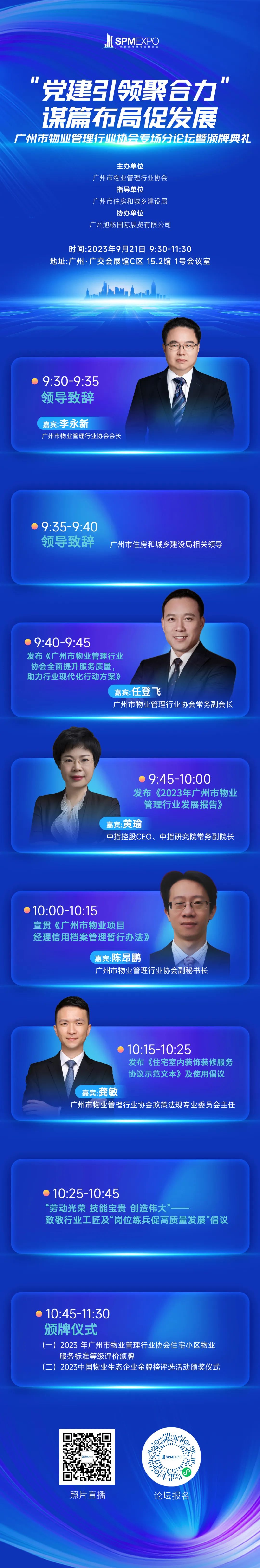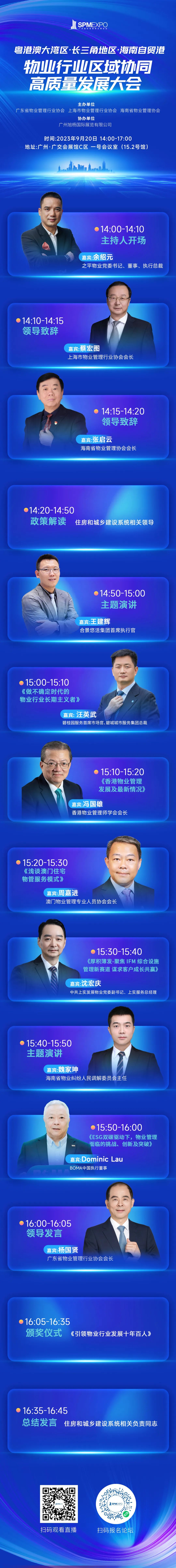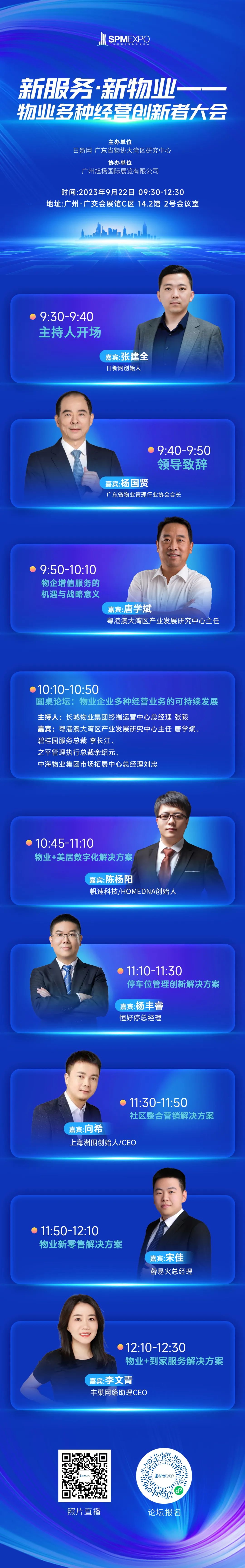 物博会同期将举行10余场高端专业活动,大咖齐聚,高峰论见促发展。在主论坛“粤港澳大湾区·长三角地区·海南自贸港物业行业区域协同高质量发展大会”和“物业进化论——直击企业核心关切 厚植行业发展动力”,将聚焦物业行业高质量发展核心话题和物业服务的本质,直指物业经济发展短板和问题,瞄准企业核心关切,为企业解惑解忧解压,厚植物业企业高质量发展沃土,为物业行业注入新势能。