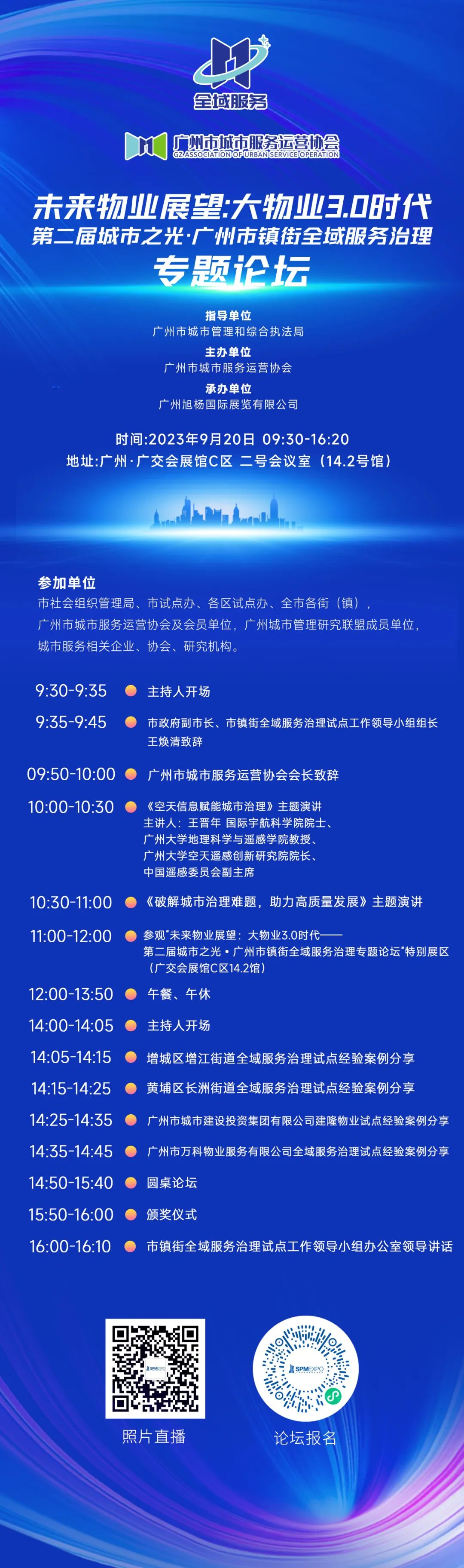 本届广州物博会聚焦未来物业展望,探讨大物业3.0时代的发展方向,为让物业企业参展更有价值,赋能行业发展,同期举办“2023城市之光·镇街全域服务治理博览会暨专题论坛”,从物业管理到城市服务,集中展示全域服务治理、智慧城市服务等方面成果,邀请政府领导、权威专家、街道书记举办专题论坛,打造一场可视、可听的行业盛会,全链条激活物业发展活力。