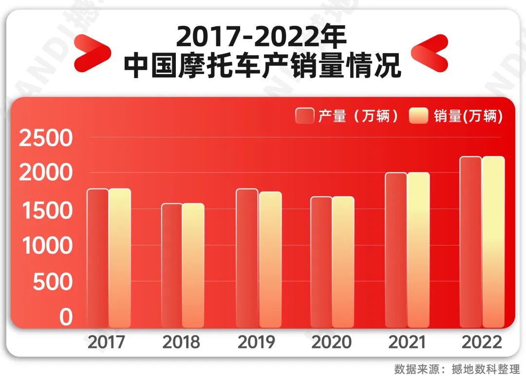 经历了连续多年的下滑后,国内摩托车市场的产销实现双增长,中国摩托车行业正强劲复苏。2021年我国摩托车产量突破2000万辆,达到近七年来新高,2022年中国摩托车产量为2129.22万辆,较上年增长5.43%,2022年中国摩托车销量为2142万辆,较上年增长6.07%。