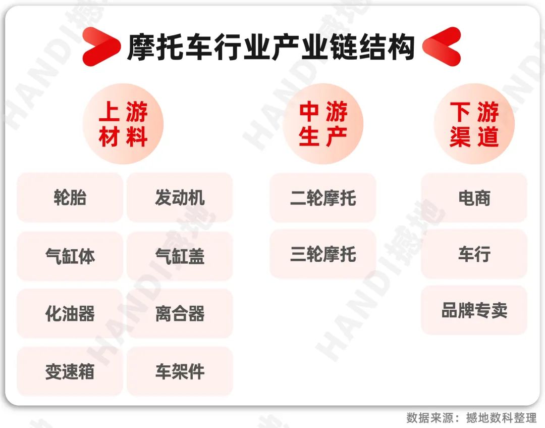 摩托车行业产业链上游主要为钢材、铝材等原材料及内燃机、电机、仪表盘、车身框架、轮胎、轴承、齿轮等零部件及配件;产业链中游为摩托车整车制造,包括钱江、隆鑫通用、五本和新本等知名企业;产业链下游为销售渠道,包括电商、车行和品牌专卖店。