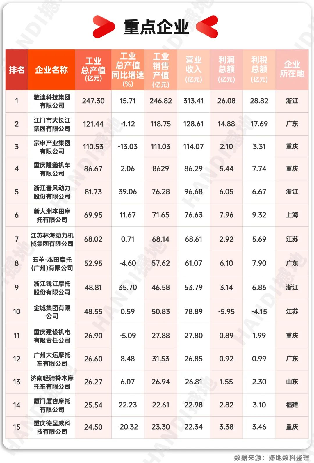 雅迪科技集团有限公司、江门市大长江集团有限公司、宗申产业集团有限公司3家企业工业总产值在百亿元以上。