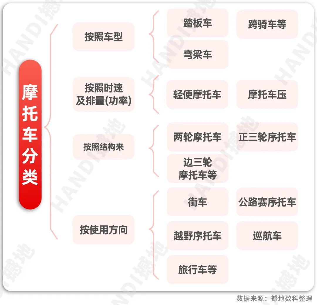 按照时速及排量(功率)来看,可以分为轻便摩托车和摩托车;按照车型来看,可以分为踏板车、弯梁车和跨骑车等;按照结构来看,可以分为两轮摩托车、正三轮摩托车和边三轮摩托车等。