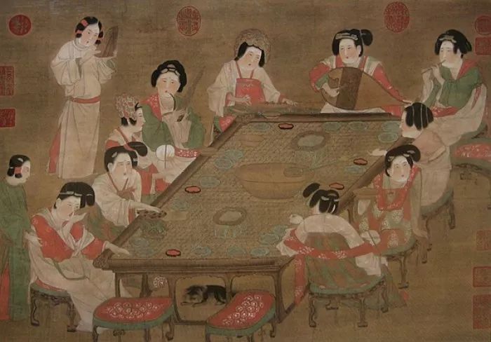 到了唐代人们围着桌子(类似长方的高案)吃饭的图画出现了,像《宫乐图》中,宫女围着案子而坐,一位宫女执长柄杓为其他宫女轮流斟酒,这才有"巡"的意味。