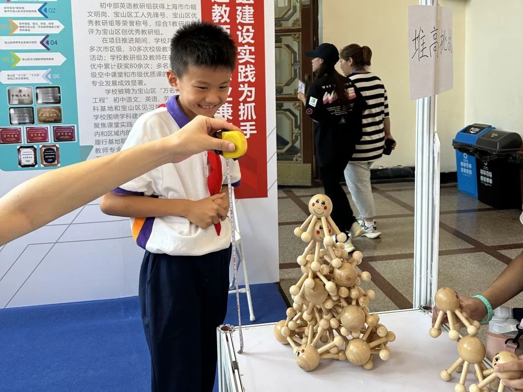 在上海教博会上我们体验了许多小活动,有运动类的,也有益智类的。让我印象最深刻的是用木头娃娃堆高塔的挑战,要求堆一座40 cm高的高塔。我尝试了很多次,都没有成功,后来我发现,只有将娃娃们组合在一起,让地基牢固,才有可能堆出高塔,最后在我的尝试下挑战成功,还获得了奖品,真是一次难忘的体验。