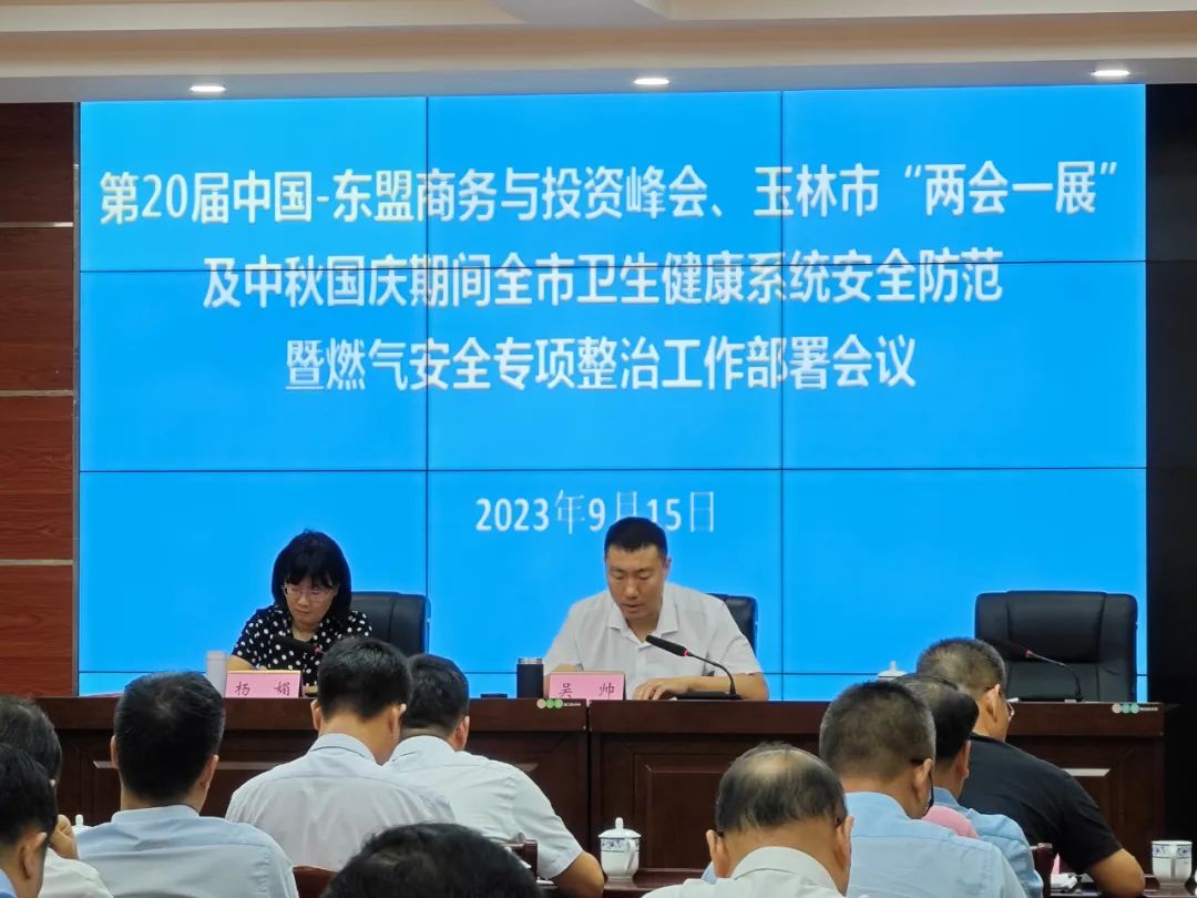 9月15日上午,玉林市卫生健康委召开第20届中国-东盟博览会中国-东盟商务与投资峰会、玉林“两会一展”及中秋国庆期间卫健系统安全防范暨燃气安全专项整治工作部署会议,玉林市卫生健康委党组书记、主任,市中医药局局长吴帅出席会议并讲话,会议由玉林市卫生健康委党组成员、副主任杨媚主持。