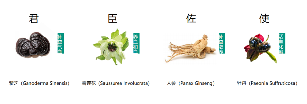专利成分,由紫灵芝、雪莲花、人参、牡丹复配而成,有改善皱纹、提升皮肤弹性、改善粗糙、保湿滋润等功效