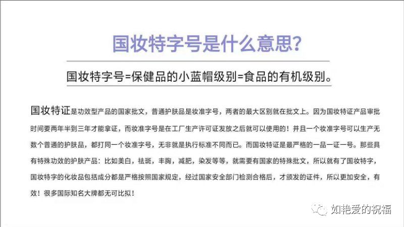 国妆特字就是符合国家要求的,无论效果还是安全性上面,都符合国家的要求的安全标准。(相当于保健品的小蓝帽和食品界的有机认证)