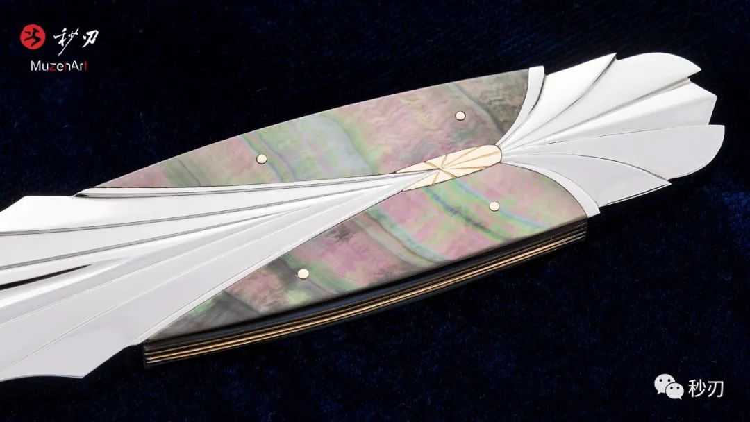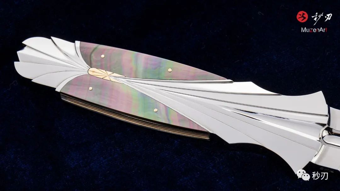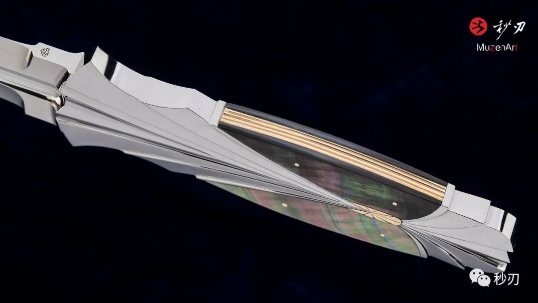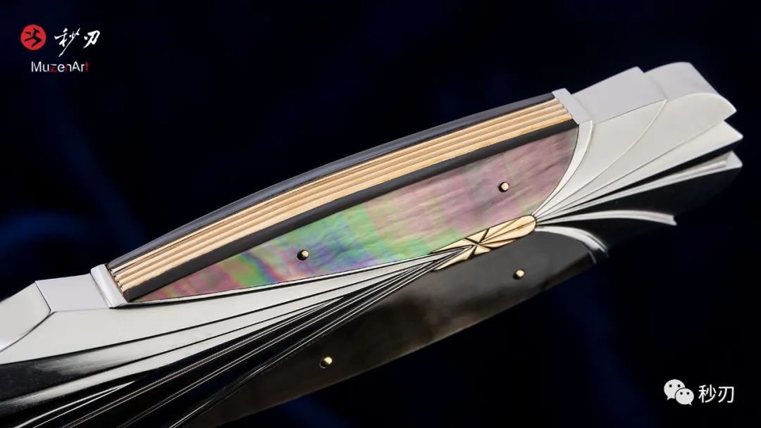 刀柄镶嵌精品深海黑贝母,并用黄金铆钉固定。贝母色彩变换丰富,如同宁静的大海又似晴朗的夜空。