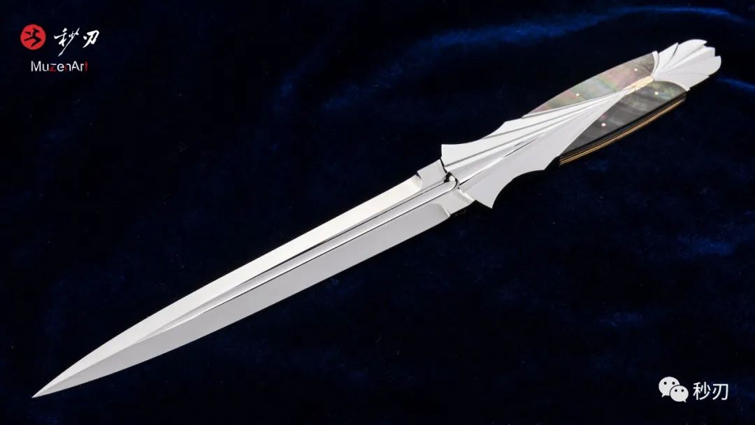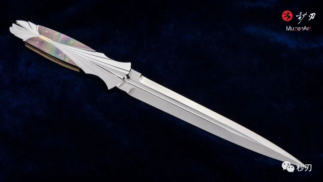 美国AKI大师肯·斯塔格沃特全手工打造,2008年亚特兰大展会最佳大奖款式。肯制刀近三十年,他获奖众多,尤其擅长制作艺术类直刀与折刀。他在曲面平面研磨,以及需要进行复杂镶嵌的领域具备超强实力,对刀剑的思维登峰造极,已经达到艺术家的领域。
